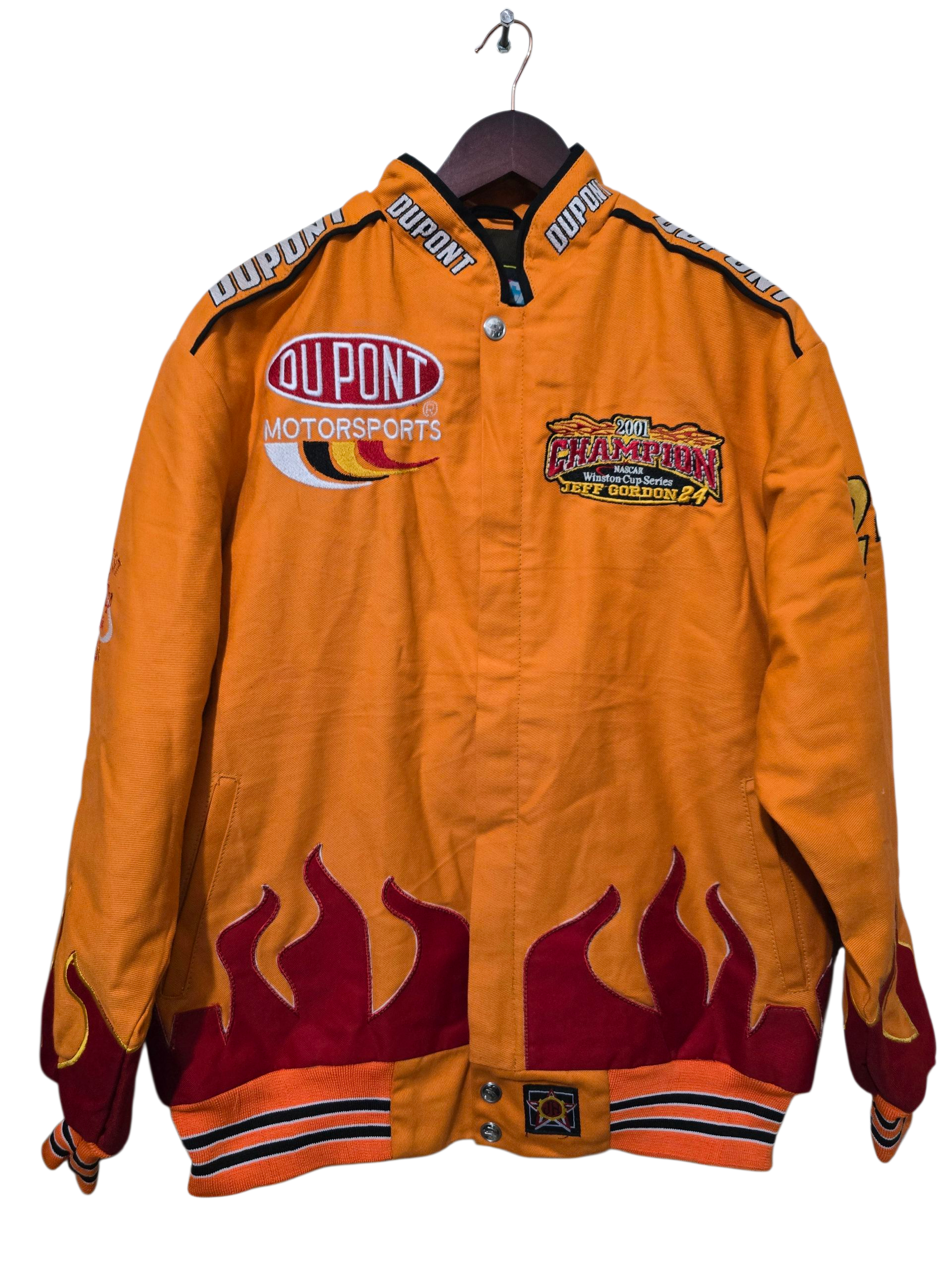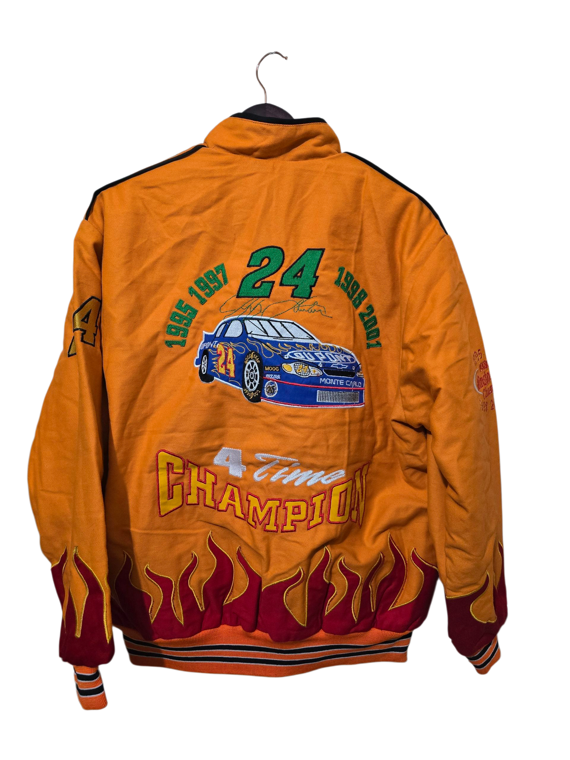 🔹 Marke: Chase Authentics (offizielle NASCAR Teamwear) 🔹 Modell: DuPont Motorsports – Jeff Gordon #24 “4-Time Champion” 🔹 Größe: L 🔹 Achsel zu Achsel: 66 cm 🔹 Länge: 72 cm 🔹 Material: Heavy Cotton Twill mit gestepptem Innenfutter 🔹 Passform: Regular Fit – leicht boxy, typisch 2000er Racingjacke 🔹 Farbe: Leuchtend Orange mit roten Flammen-Applikationen und Multicolor-Stickereien 🔹 Details: Große Rückenstickerei mit #24 Monte Carlo & „4 Time Champion“-Schriftzug, DuPont & NASCAR Logos, doppelte Druckknopfleiste und Reißverschluss, elastische Bündchen & Saum im Racing-Streifen-Look, bestickter Kragen mit DuPont-Schriftzug 🔹 Herkunft: Made in China 🔹 Herstellungszeitraum: ca. 2001–2003