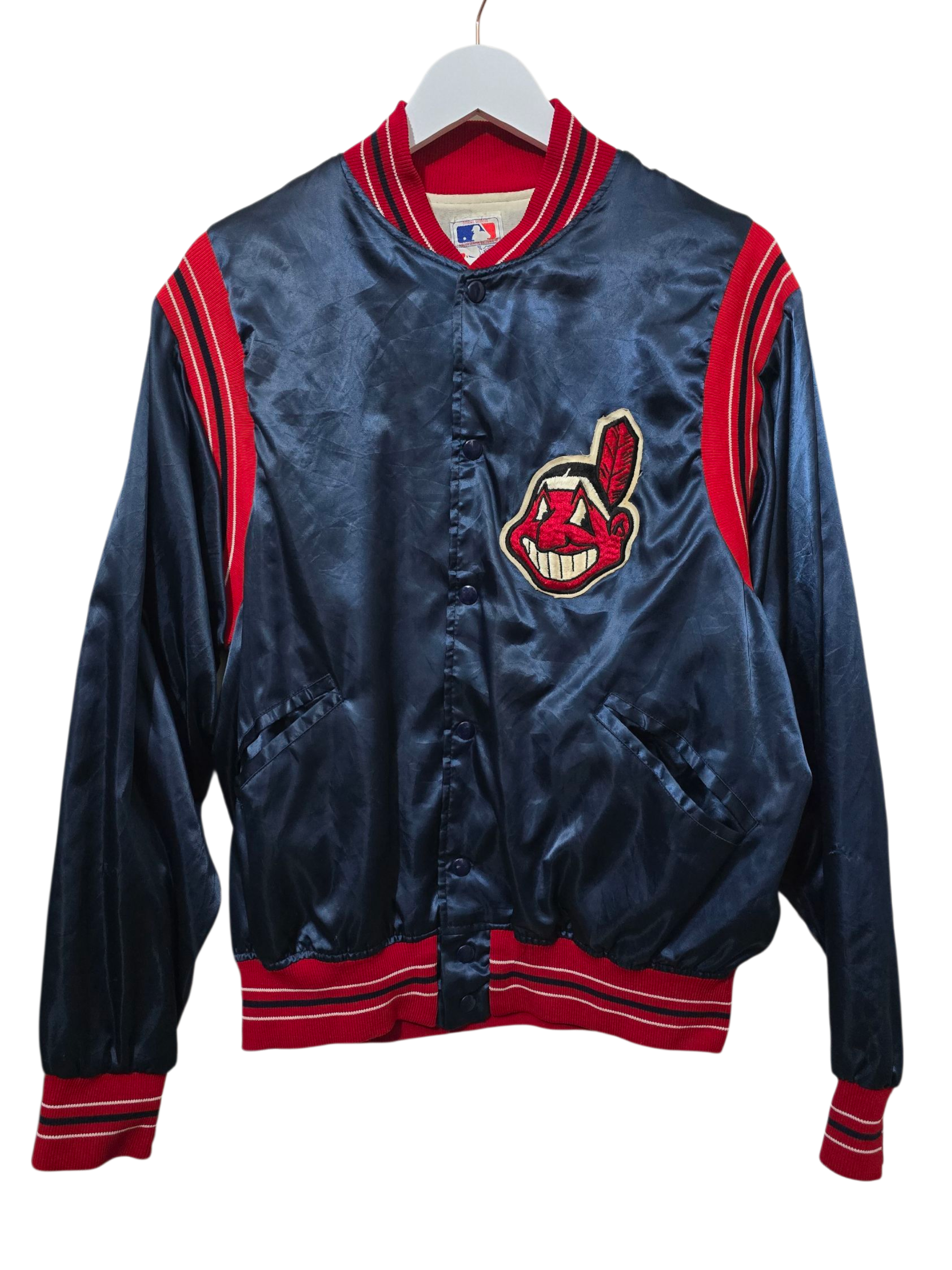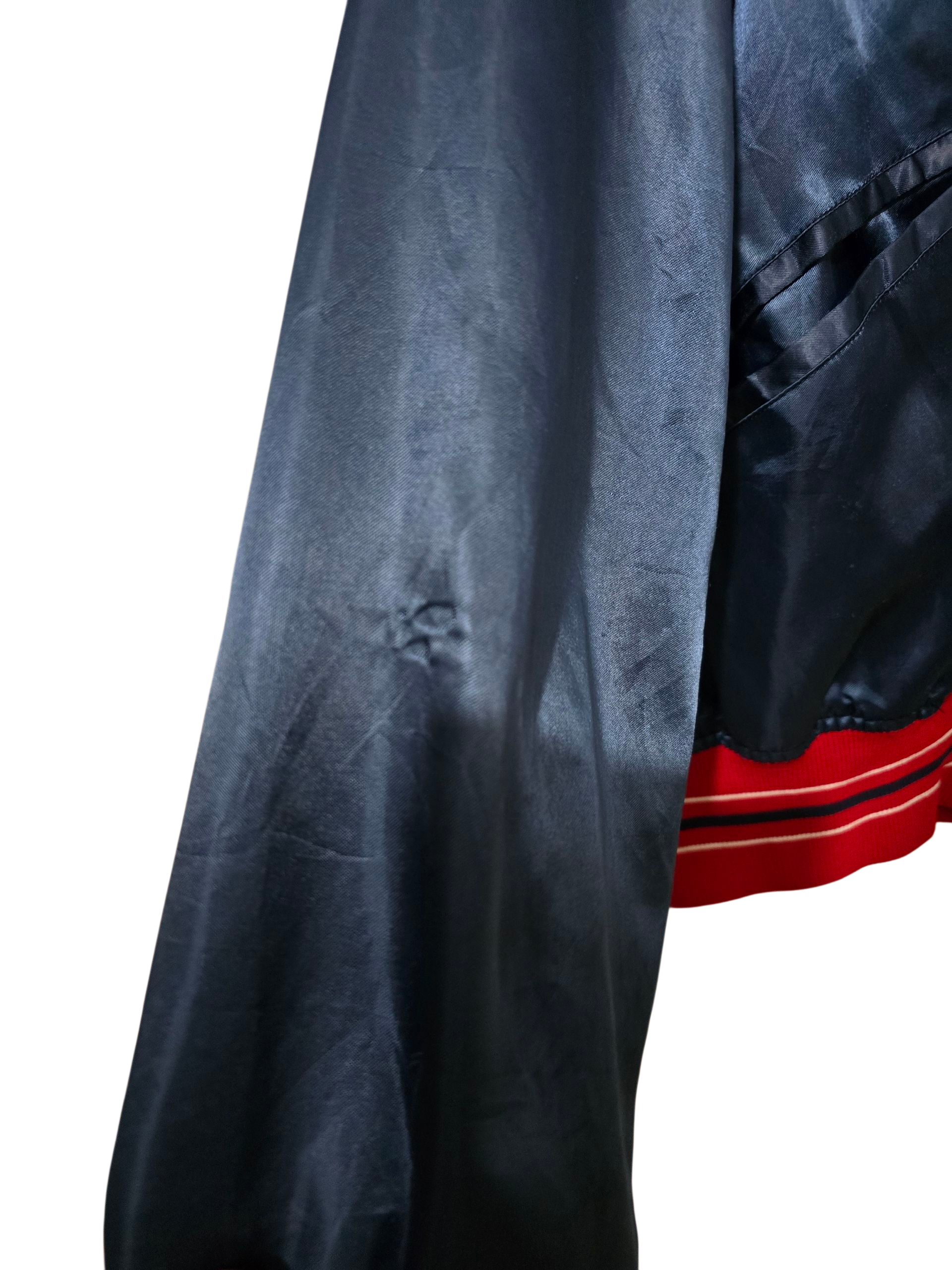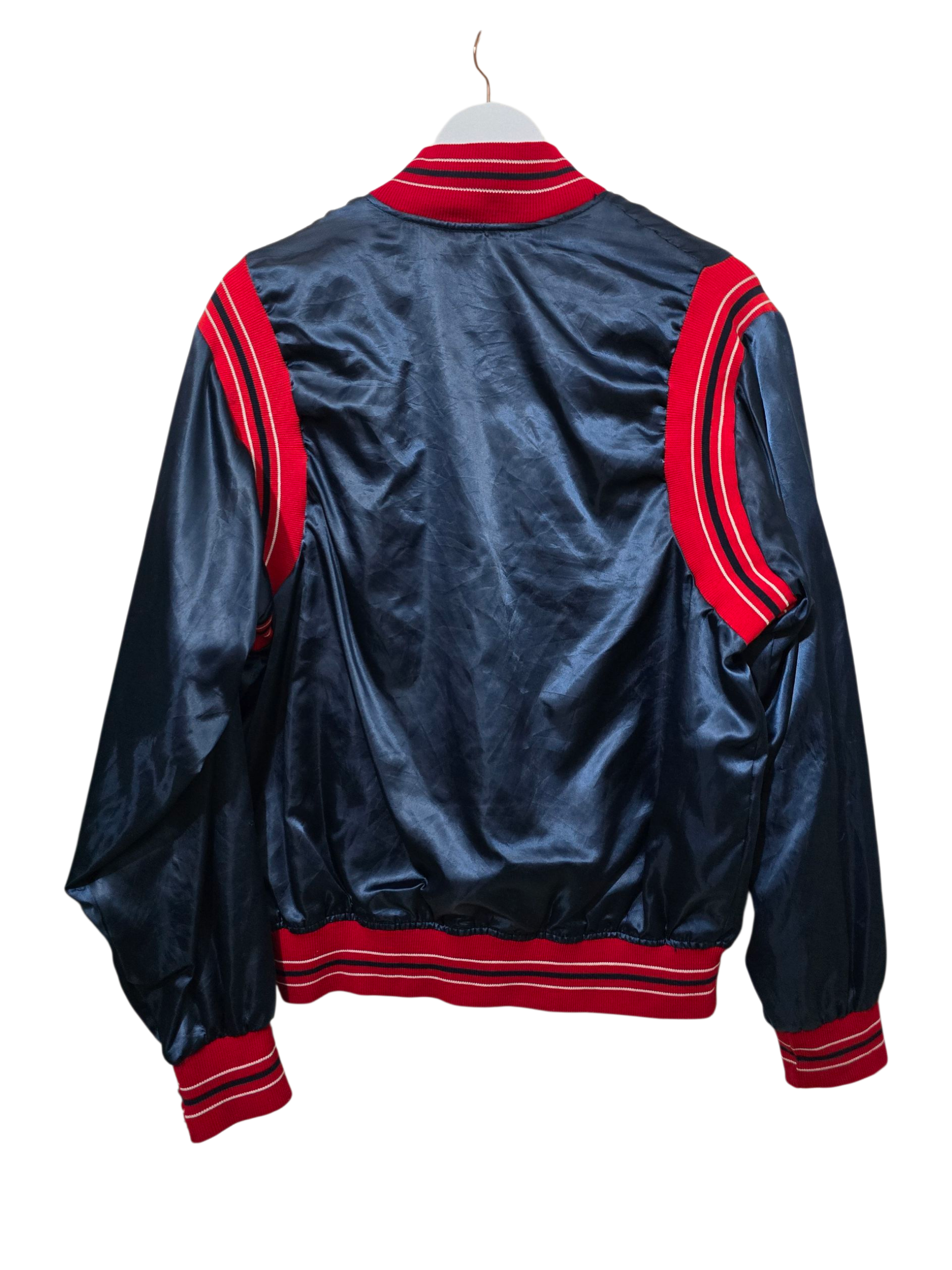 Klassische satinierte Bomberjacke von Felco aus den 80er/90er Jahren. Navy mit roten Akzenten, markantem Front-Patch und gestreiften Rippbündchen – ein seltenes Piece im typischen Vintage-Look.