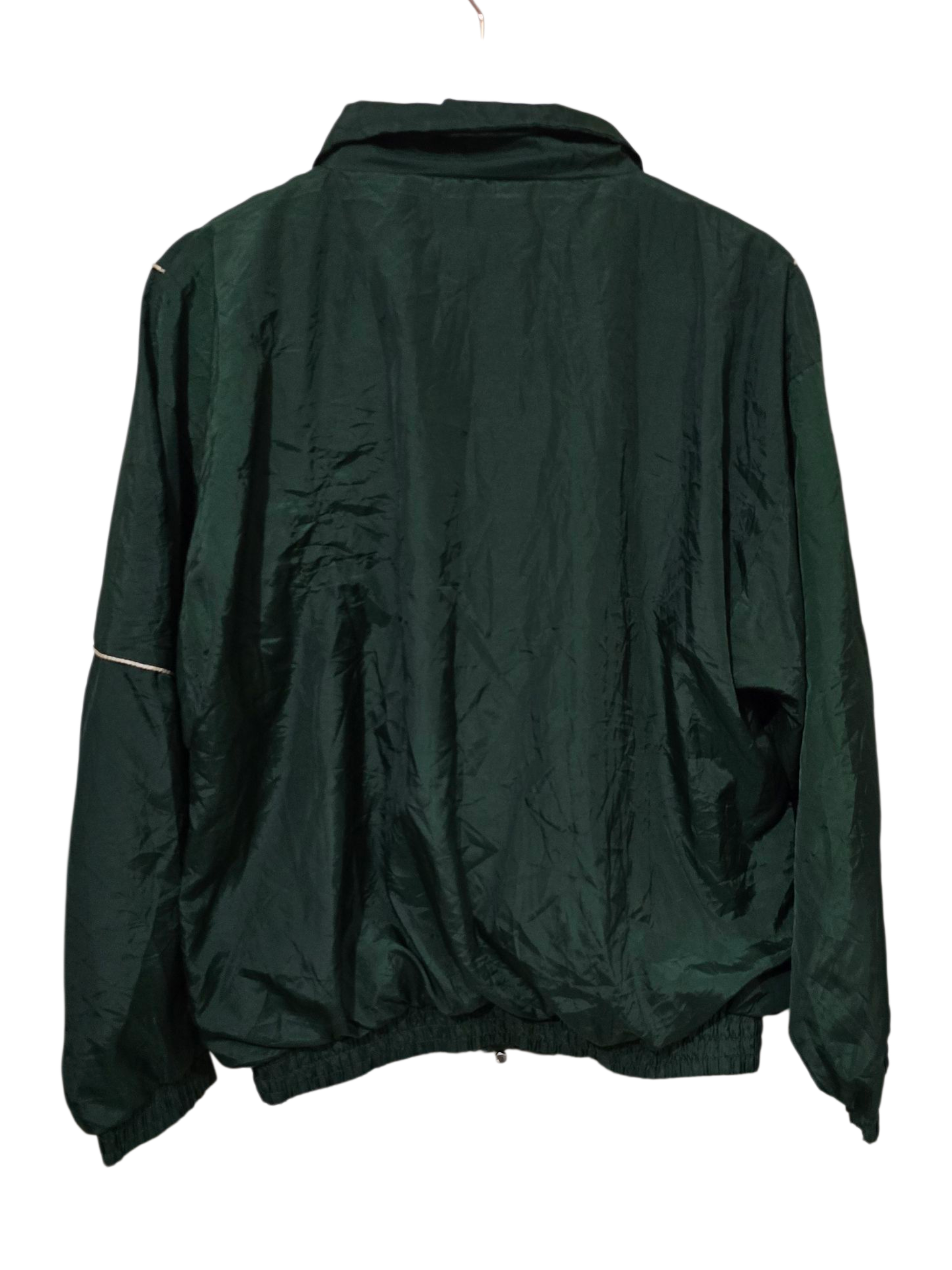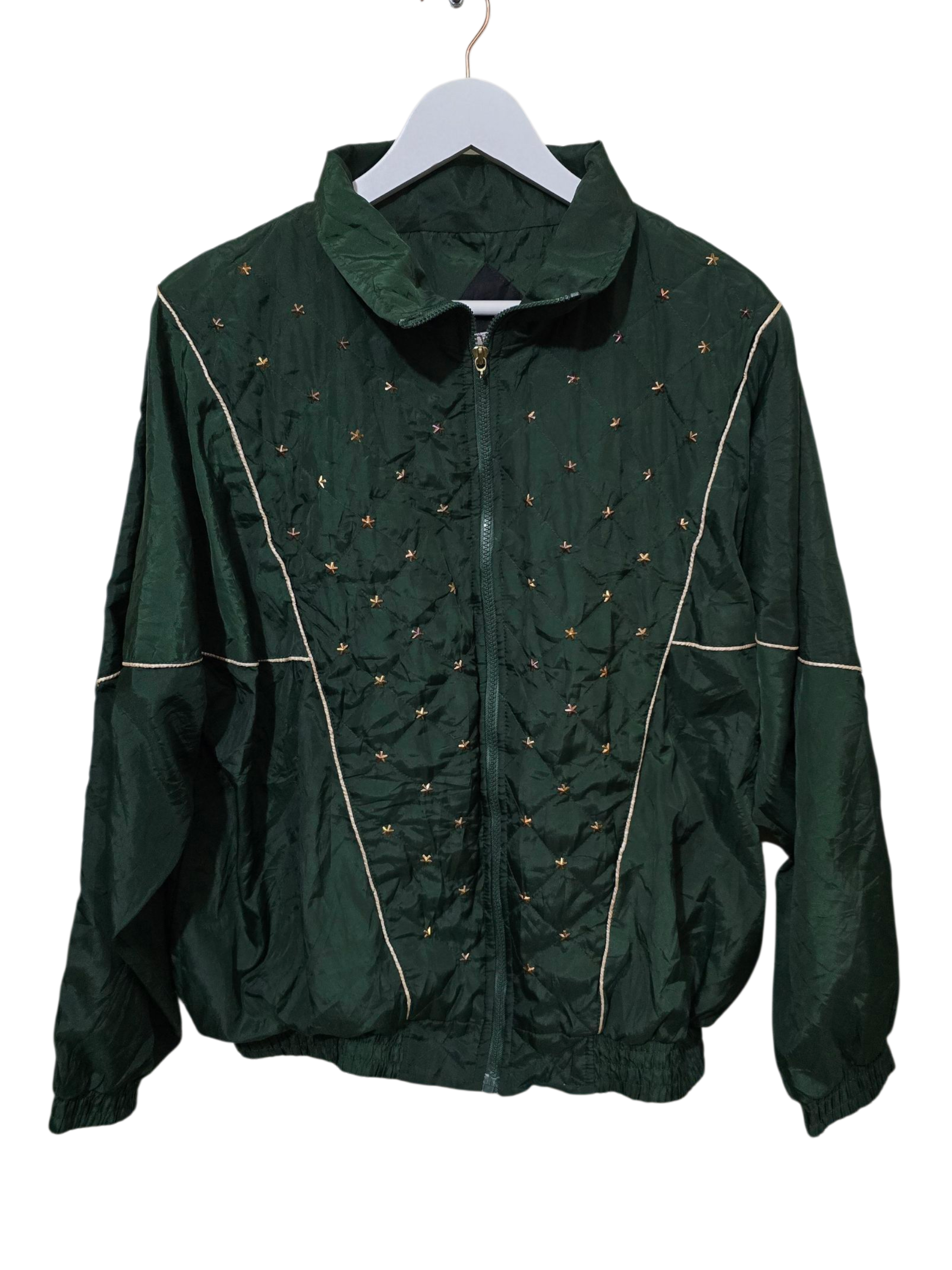 Vintage Nylonjacke in Smaragdgrün mit gestepptem Muster vorne und feiner Stickerei. Klassische Oversized-Silhouette im 80s/90s Look.