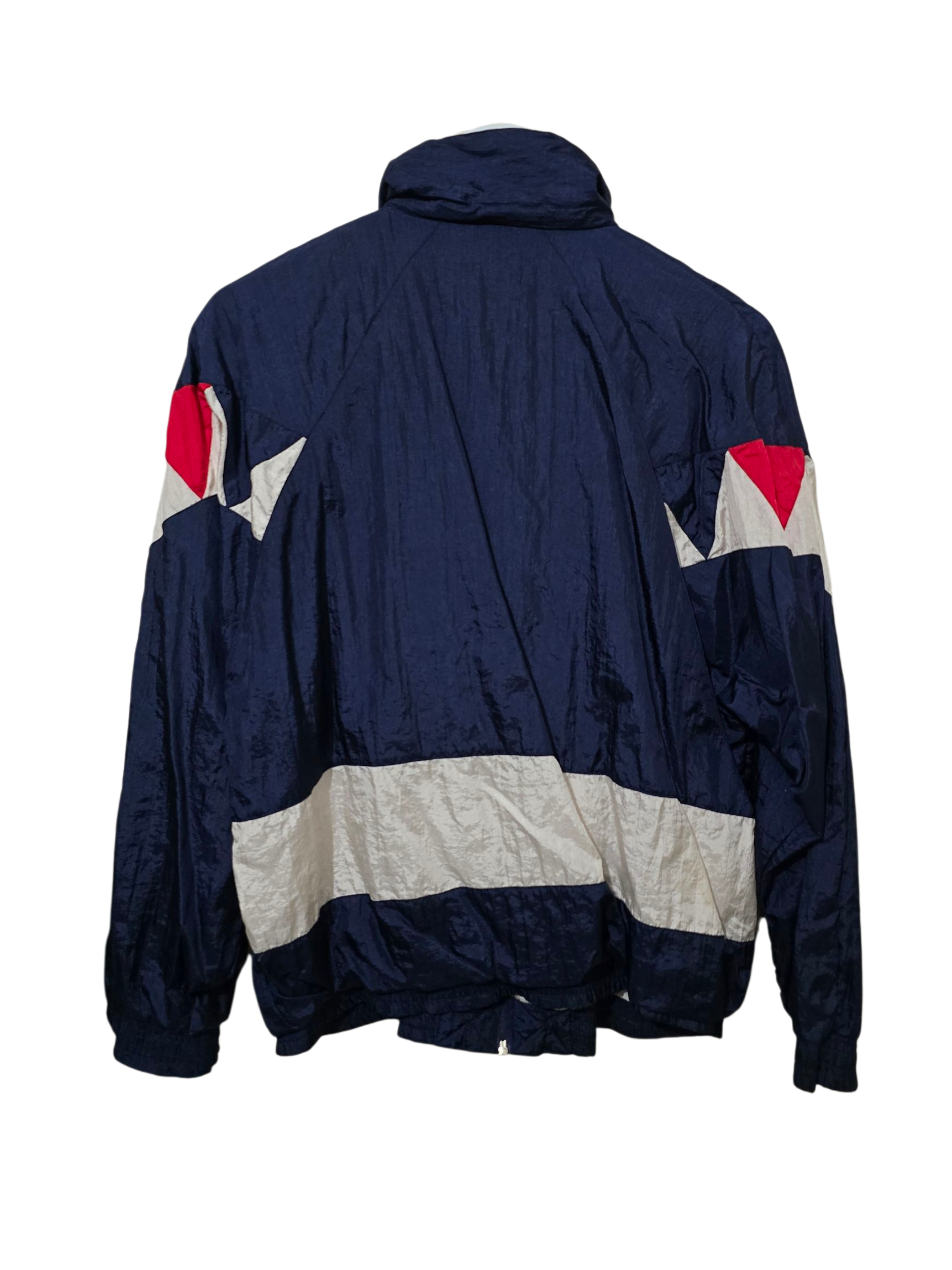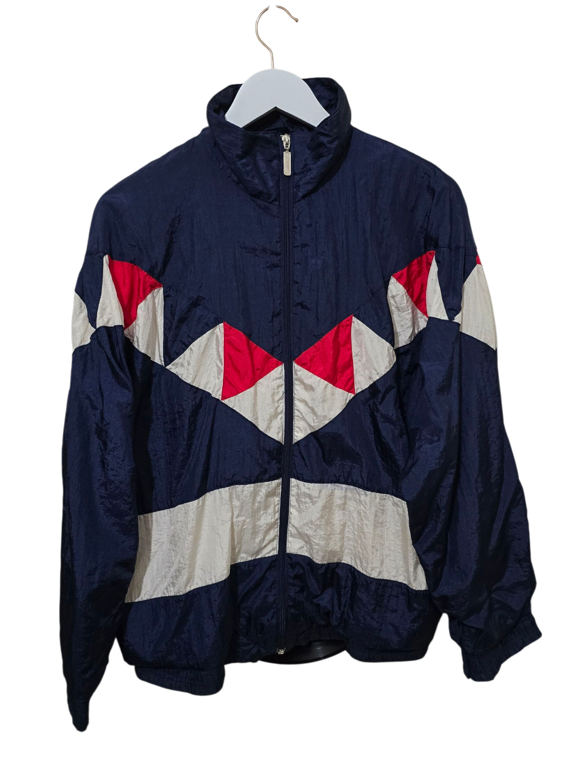 Stylische Janeve Windbreaker Jacke aus den Jahren 1989–1993 in Marineblau mit auffälligem geometrischem Muster in Rot und Weiß. Klassischer Oversized-Schnitt mit kurzem, boxy Fit – perfekt für den typischen Retro-Look der späten 80er und frühen 90er.