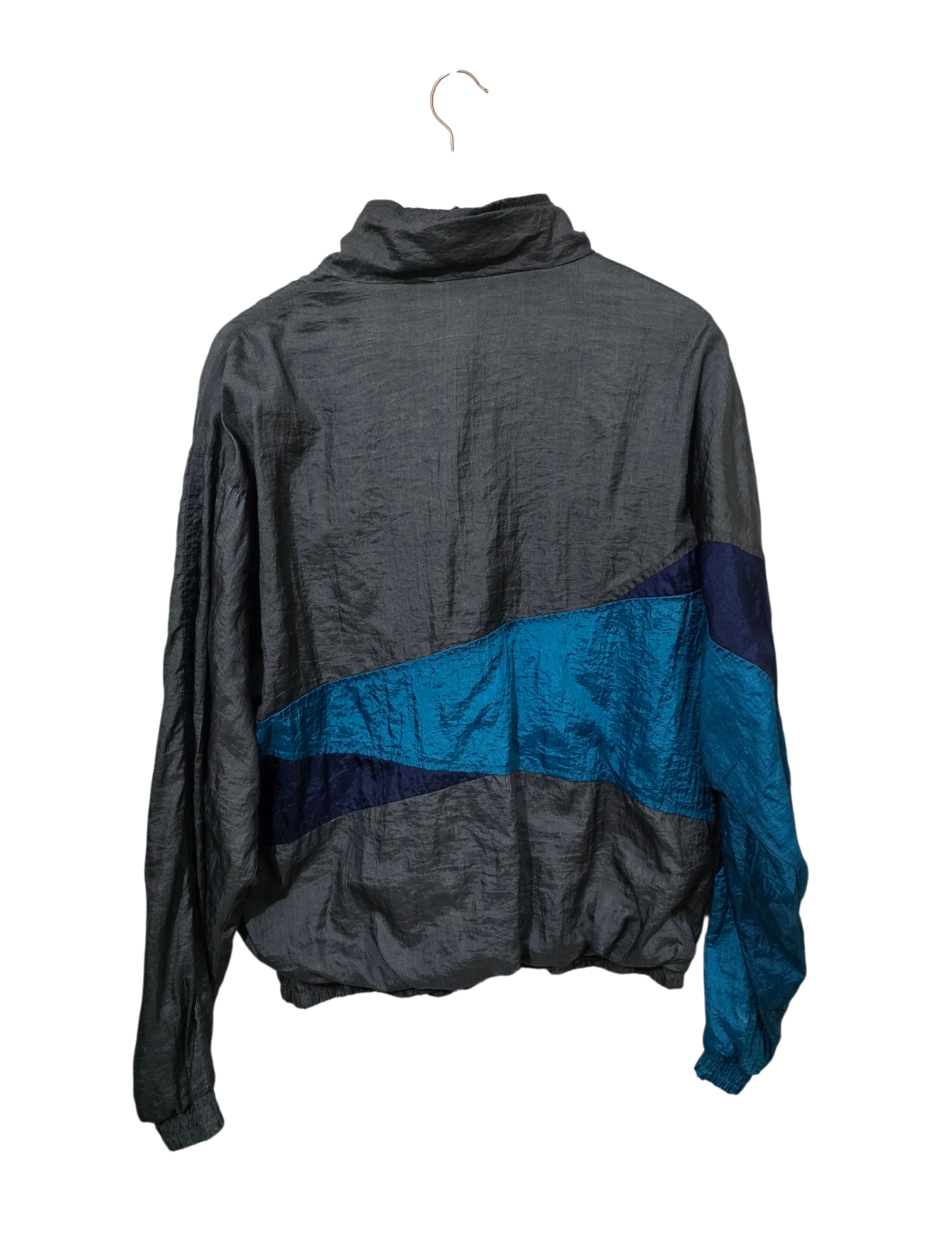 Klassische 90s FIRST RUN Trackjacke in Grau- und Blautönen mit diagonalen Farbpanels. Leicht boxy geschnitten und perfekt für einen authentischen Retro-Look.