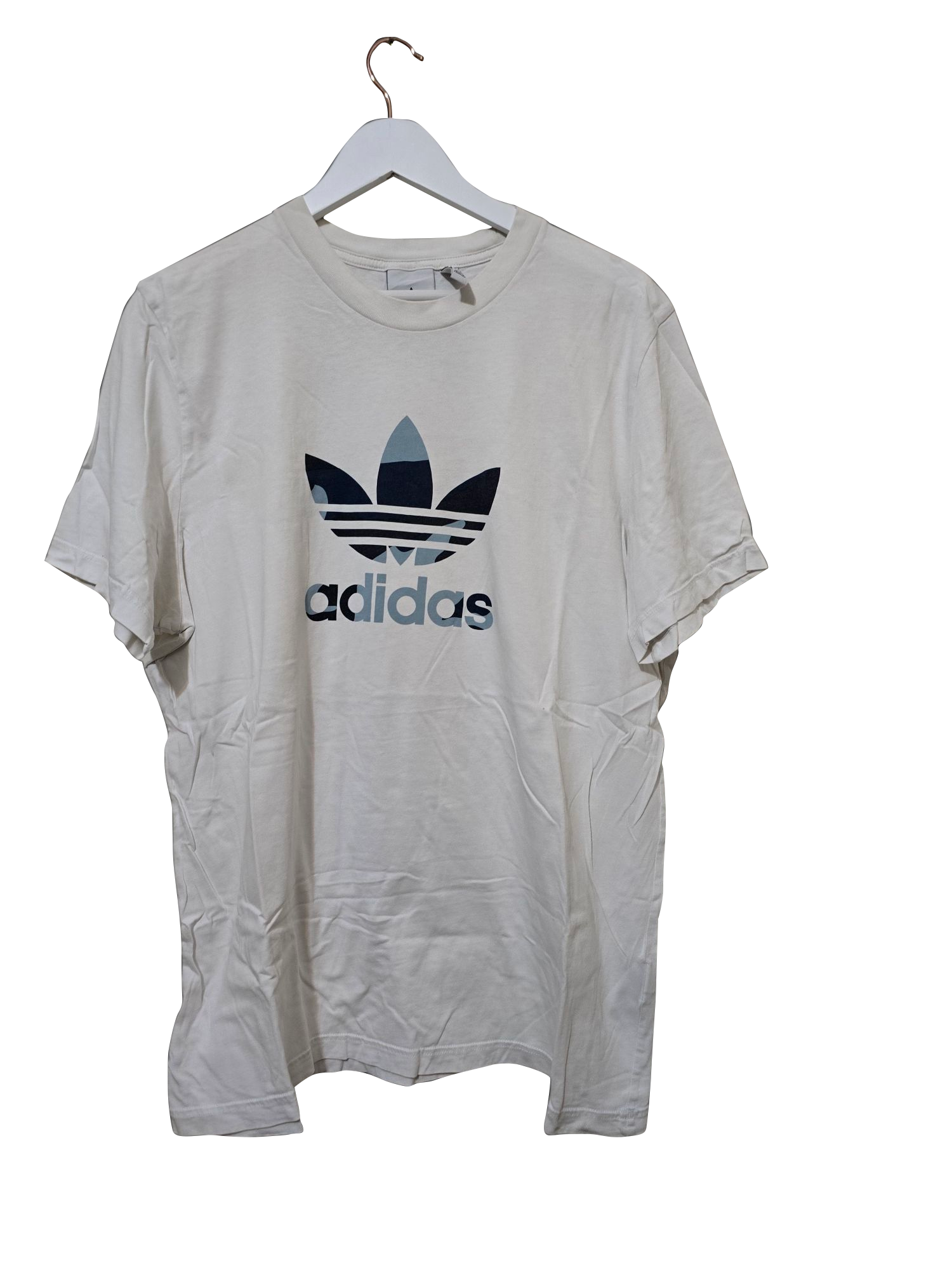 Klassisches T-Shirt von Adidas mit großem Trefoil-Logo auf der Front. Der dezente Cremeton kombiniert mit dem blau-grauen Print macht es zu einem vielseitig kombinierbaren Piece für Alltag & Streetwear-Look.