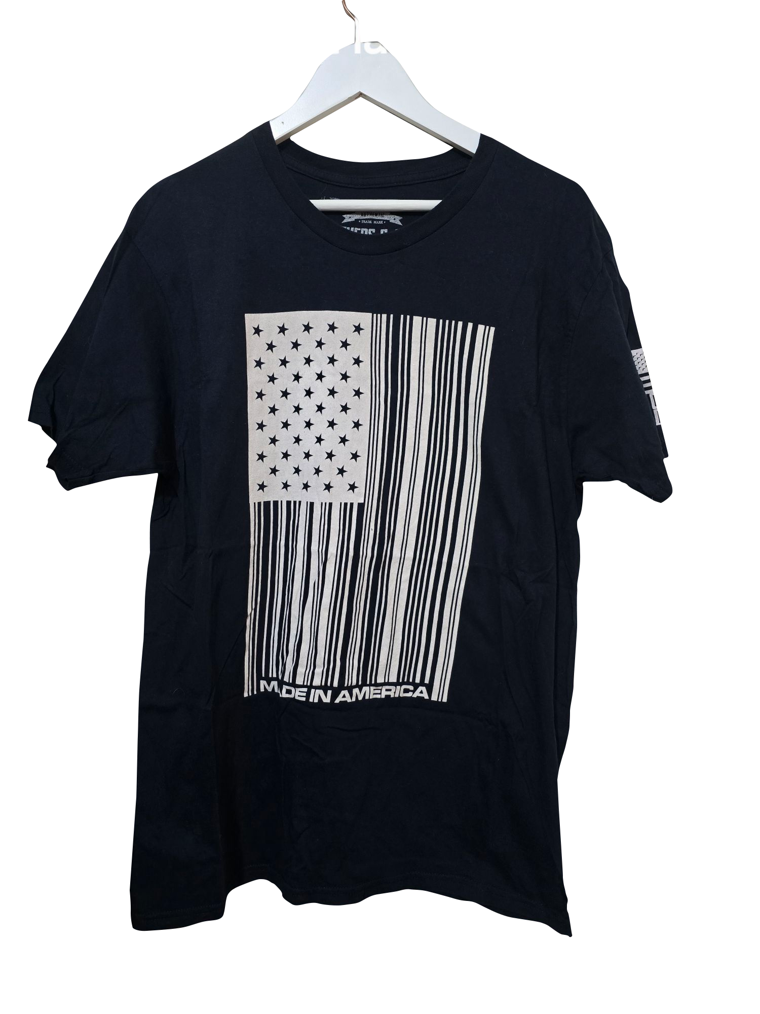 Statement-Tee in tiefem Schwarz von Brothers & Arms USA – mit auffälligem Barcode-Flaggen-Print und dem Slogan „Made in America“. Ideal für Fans von Military-, Tactical- oder Patriotic-Style. Der weiche Stoff und der klassische Schnitt sorgen für Tragekomfort, während der Print klare Kante zeigt.