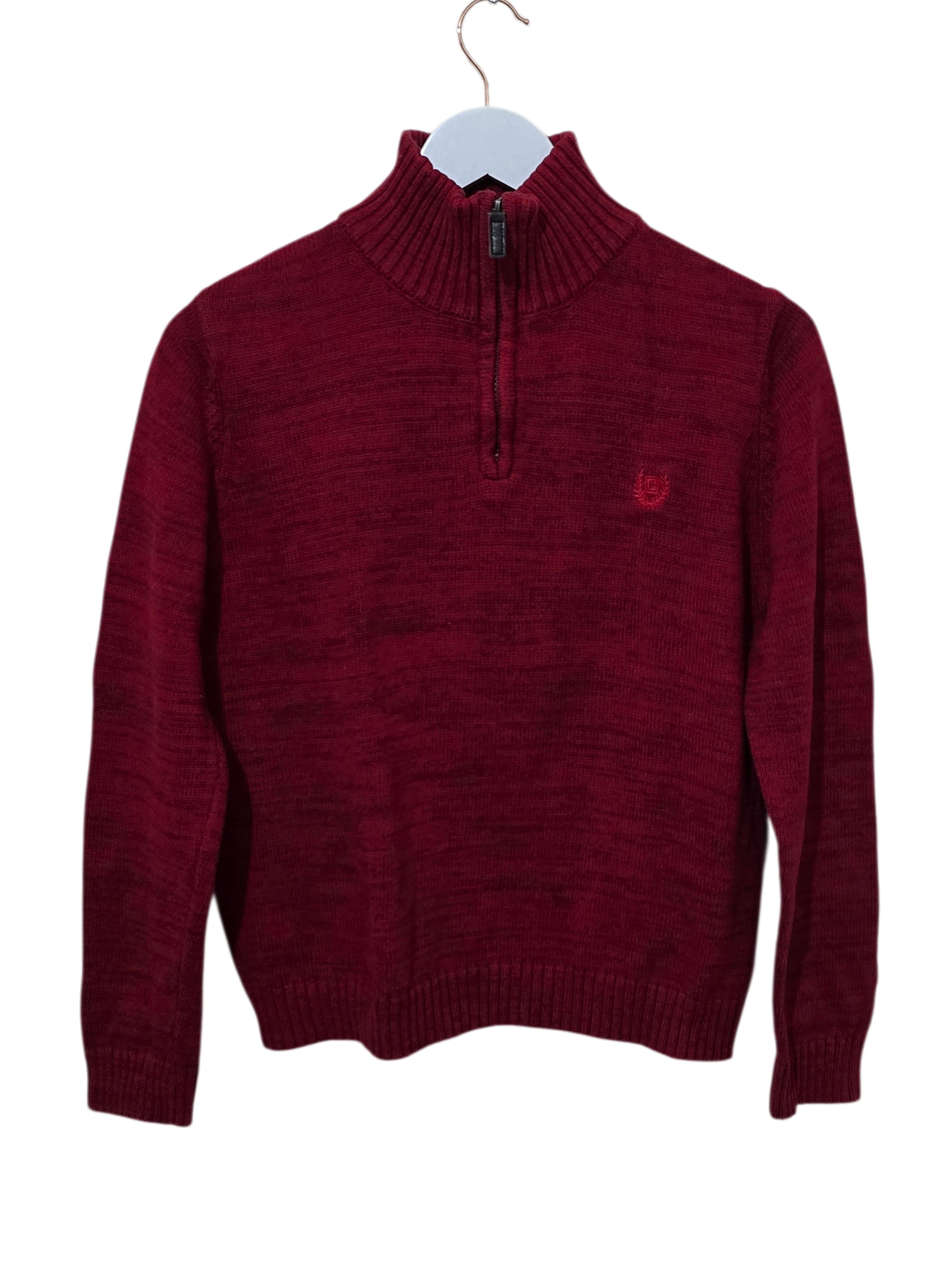 Klassischer Chaps Strickpullover mit halbem Reißverschluss und geripptem Stehkragen. Zeitloses Design in warmer Bordeaux-Farbe, angenehm weiches Strickmaterial und hochwertige Verarbeitung. Ursprünglich als Kindergröße L ausgezeichnet, wird er als XXS für Erwachsene getragen und fällt dabei bewusst oversized aus.