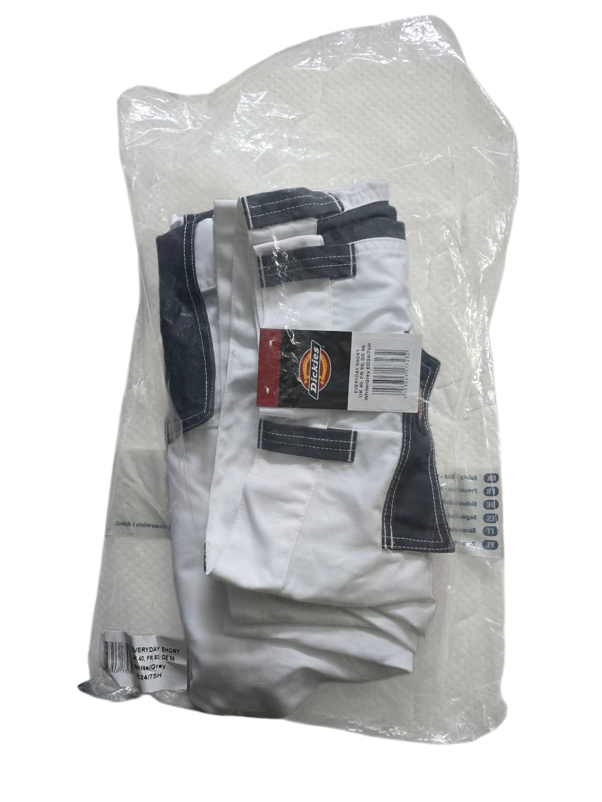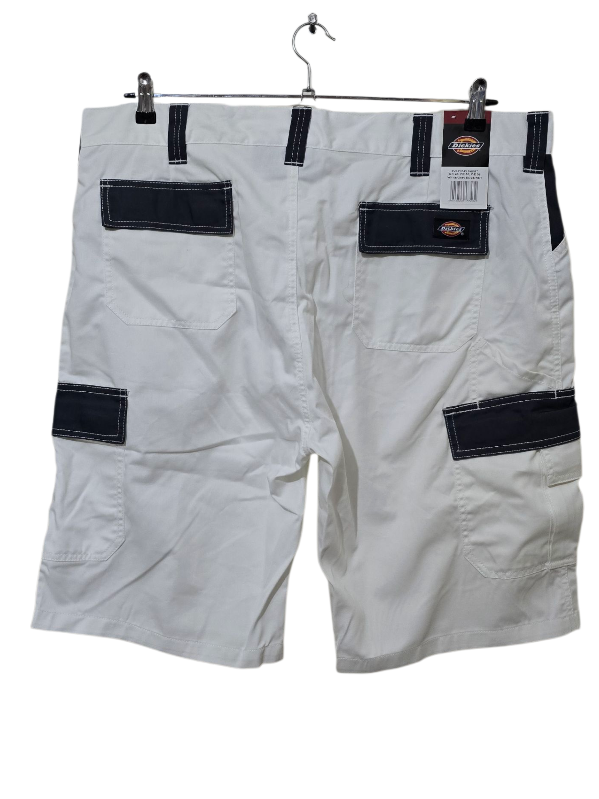 Robuste Workwear-Shorts von Dickies in Weiß mit dunkelgrauen Kontrasten. Praktisches Design mit mehreren Taschen – ideal für Arbeit oder Freizeit.