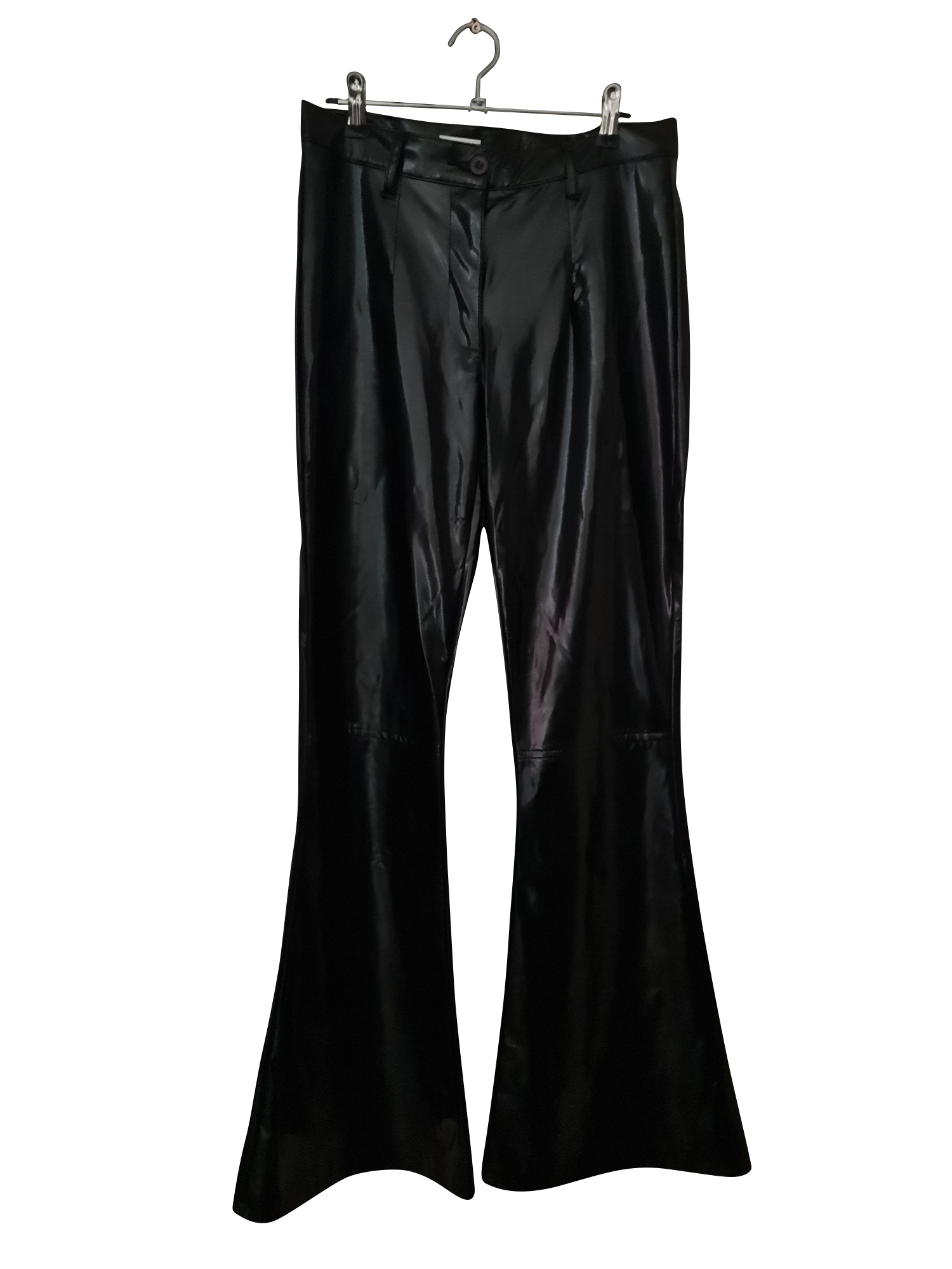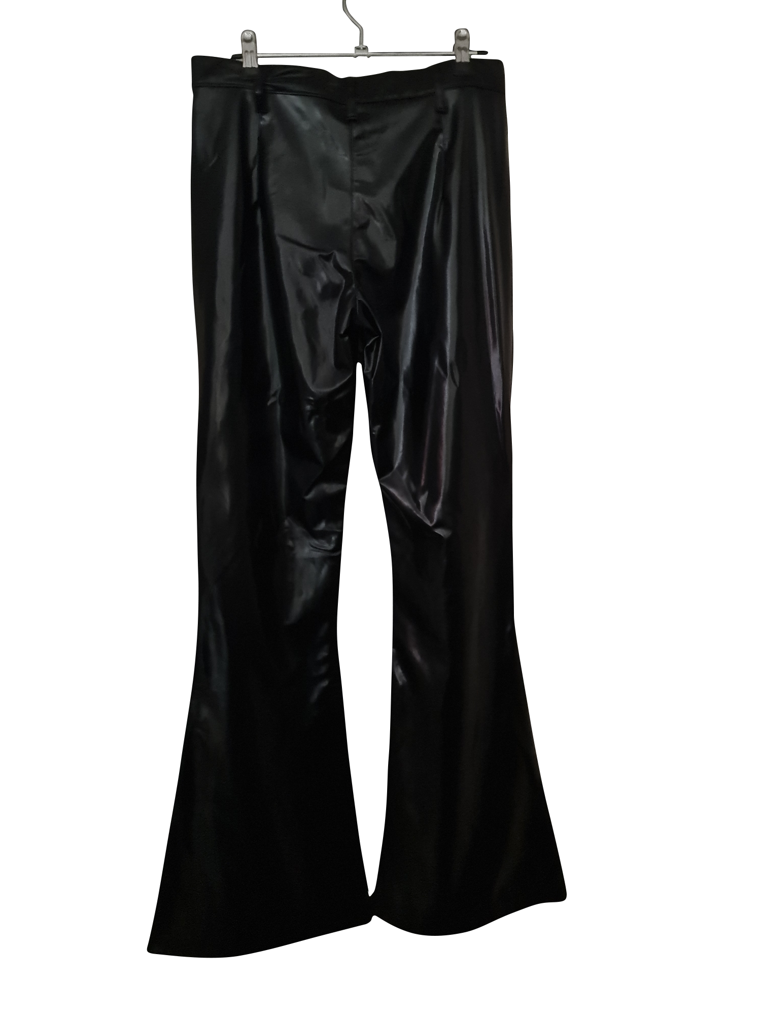 Auffällige, glänzende Schlaghose in Lederoptik – ein stilvoller Mix aus Retro-Vibes und futuristischem Glam. Das ausgestellte Bein, kombiniert mit der glatten Oberfläche, macht diese Hose zum echten Statement-Piece für besondere Anlässe oder mutige Alltagslooks.