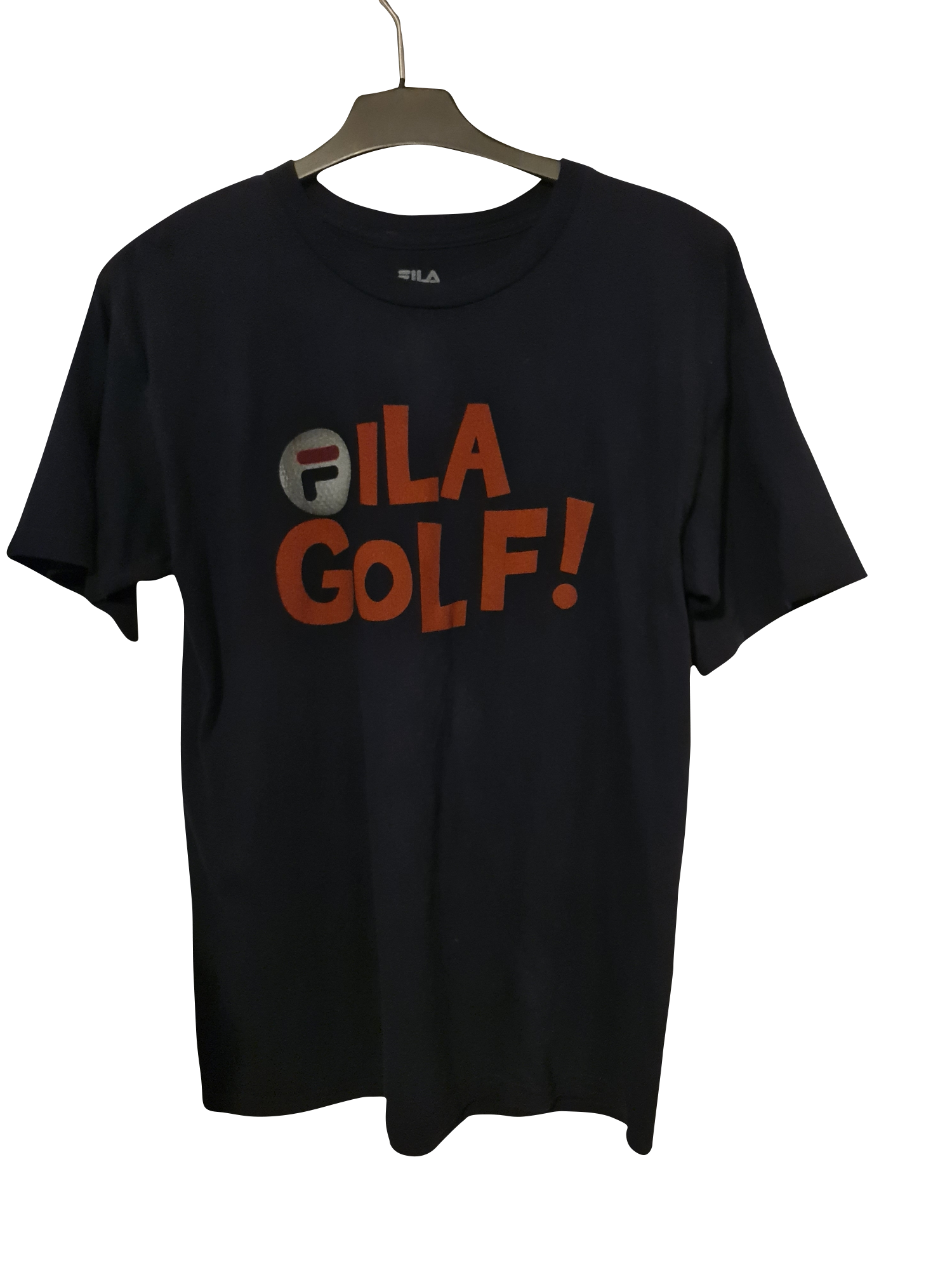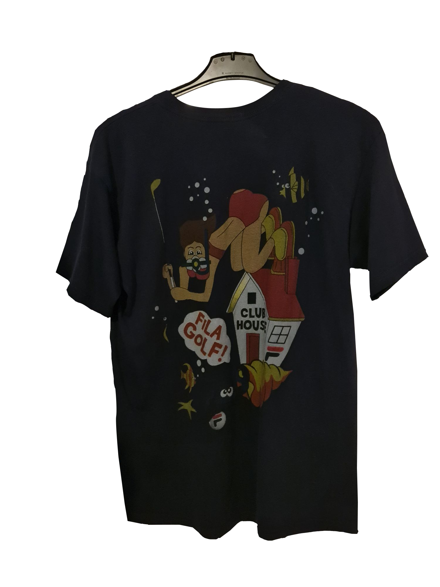 Vintage-T-Shirt von Fila mit auffälligem „Fila Golf!” Print auf der Brust und großem Comic-Backprint mit Taucher, Golfausrüstung und Clubhouse.