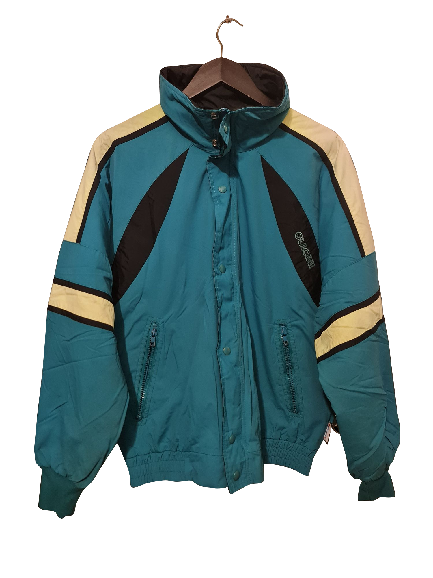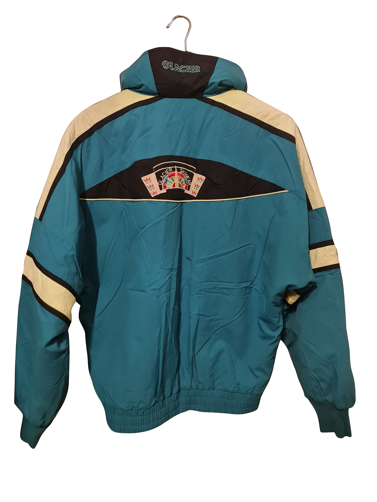 Kultiges Piece aus Kanada: Diese Glacier-Skijacke bringt 90s-Vibes mit kräftigem Türkis, Retro-Stickereien und typischem Colourblocking – ideal für Vintage- und Streetwear-Looks mit Charakter.