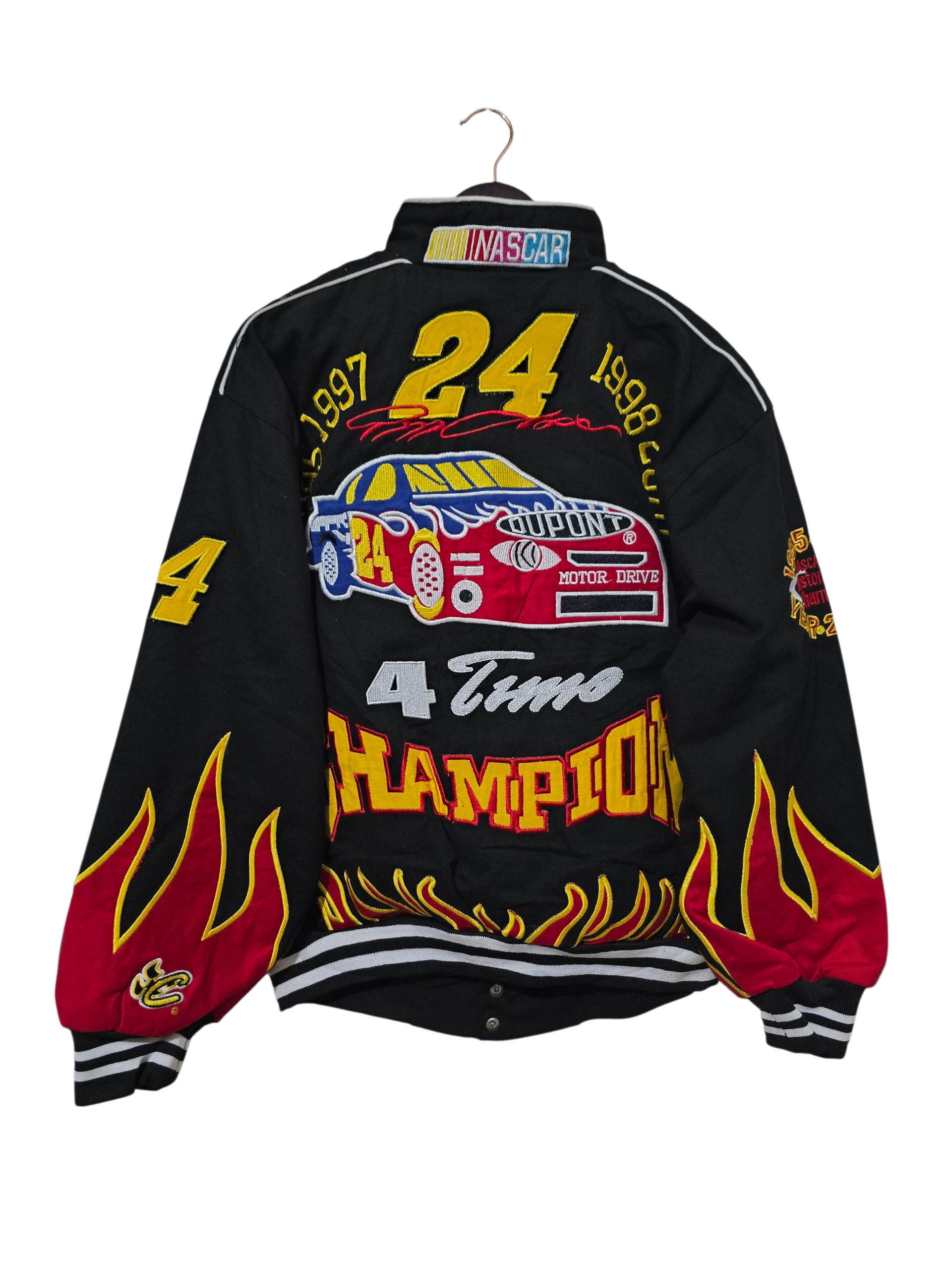 🔹 Details: Hochwertige Stickereien (DuPont, NASCAR, 4-Time Champion, Jeff Gordon, #24), große Rückenstickerei mit Flammen-Design und Monte Carlo Car, doppelte Druckknopfleiste & Reißverschluss, bestickter Kragen, elastische Bündchen & Saum im Racing-Streifen-Look