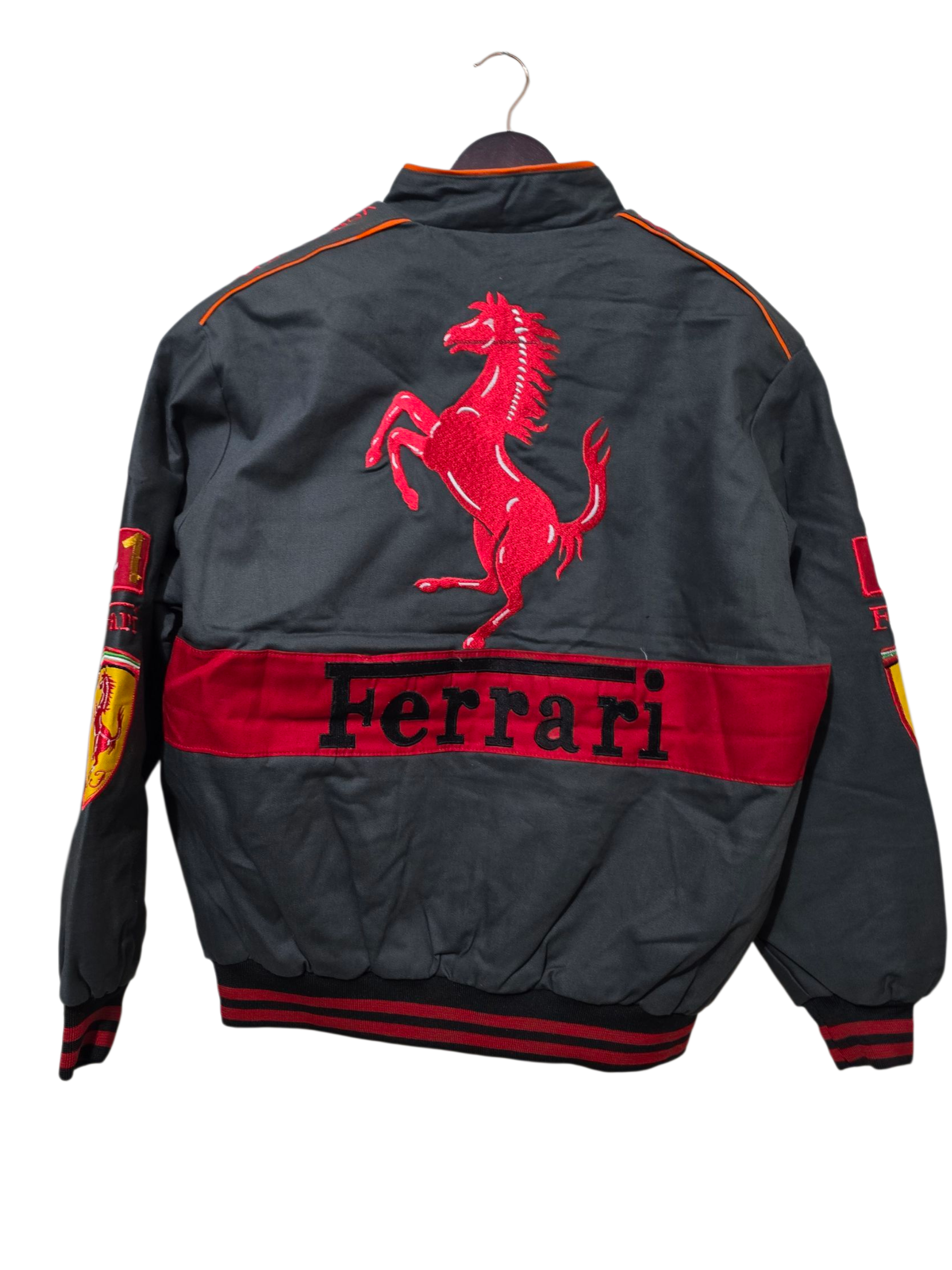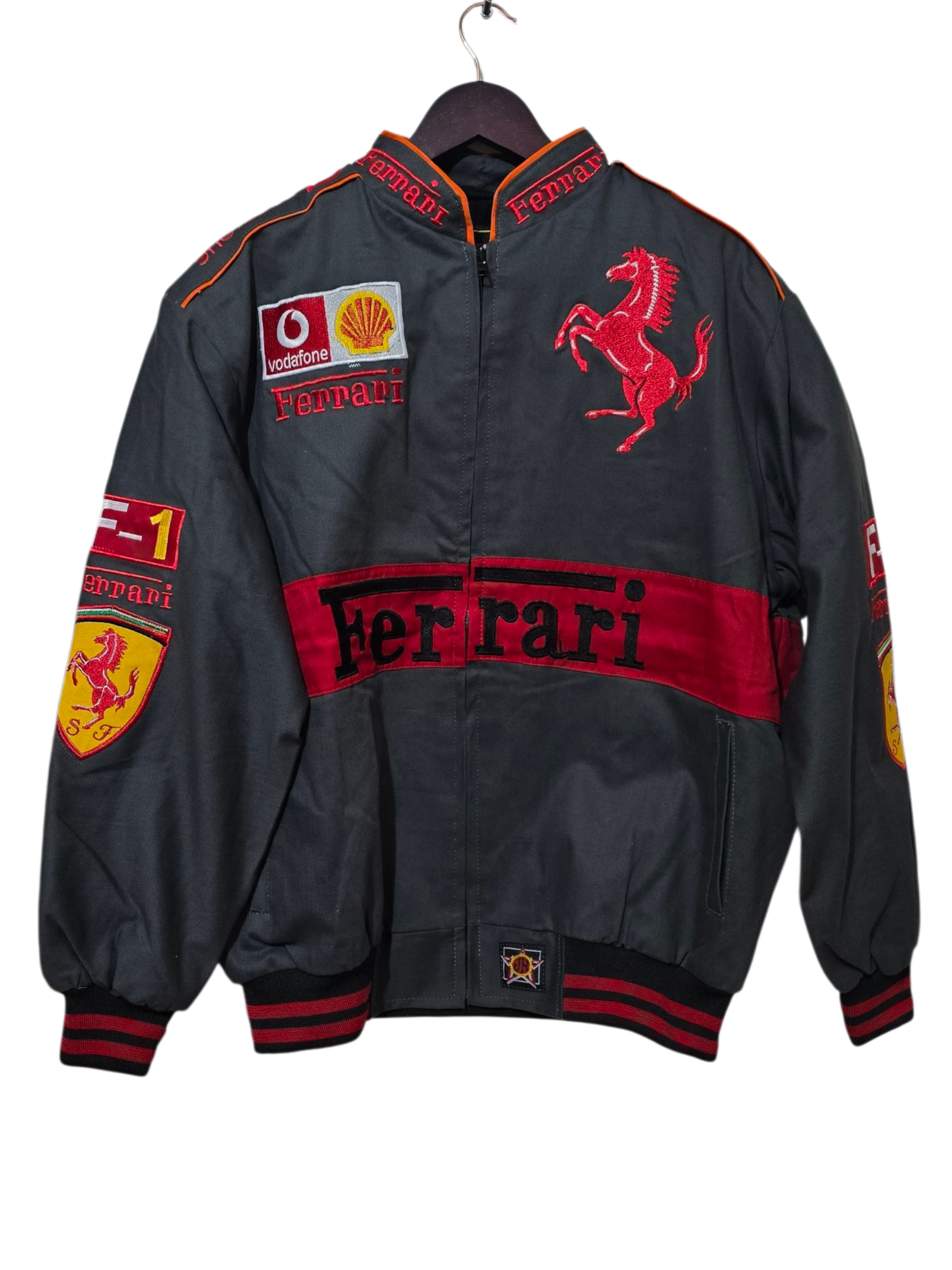 Ferrari Racingjacke von JH Design, im klassischen Schwarz-Rot gehalten. Reworked Version mit leichten Anpassungen an den Stickereien – ikonisches Vintage Racingpiece aus den frühen 2000ern mit typischen Sponsorenlogos.