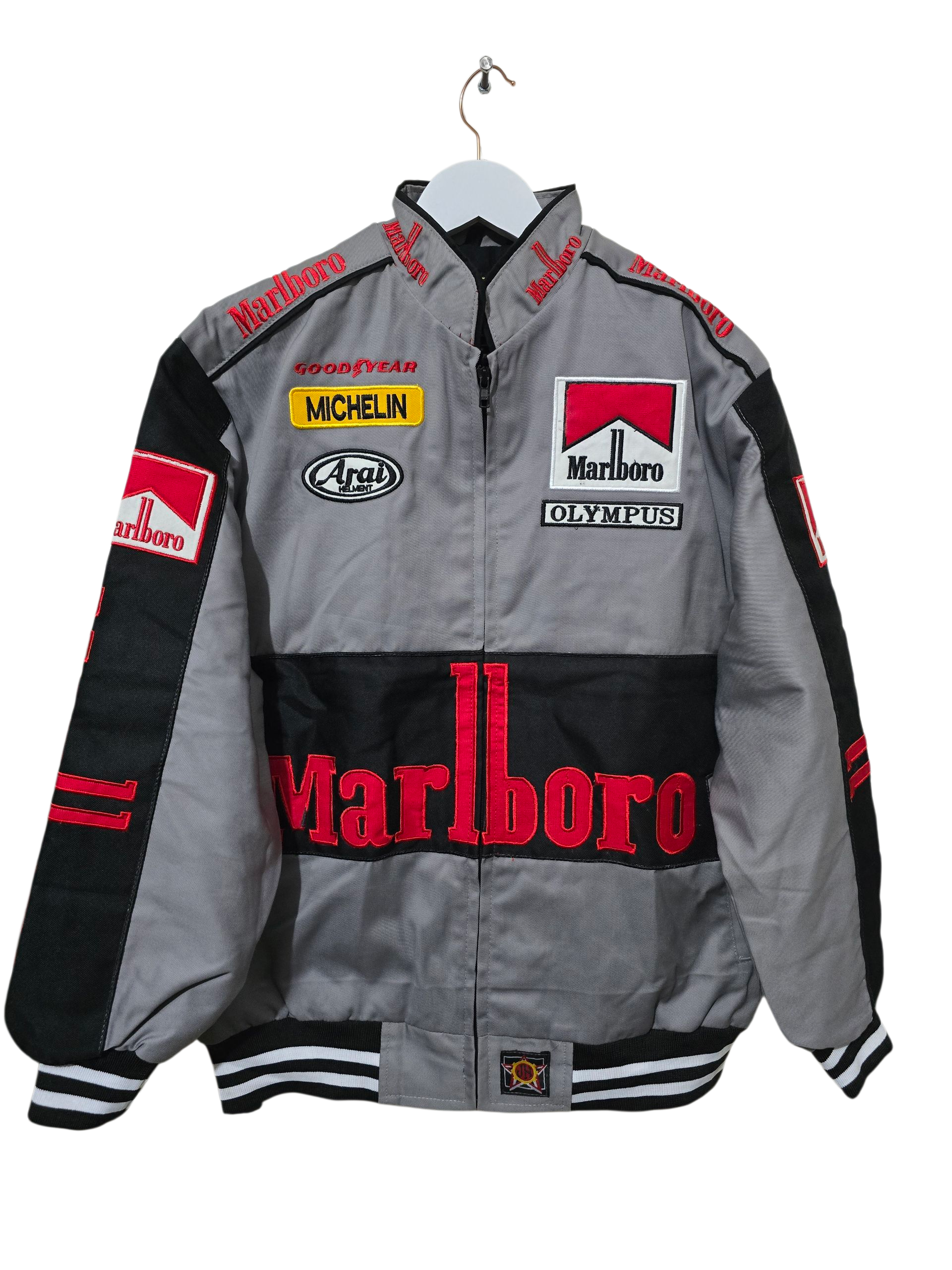 🔹 Details: Mehrfarbige Stickereien (Marlboro, Goodyear, Michelin, Arai, Olympus u. a.), doppelte Druckknopfleiste, gestickte Schulterlogos, großer Marlboro-Schriftzug auf Rücken & Ärmeln, elastische Bündchen & Saum im Racing-Streifen-Look