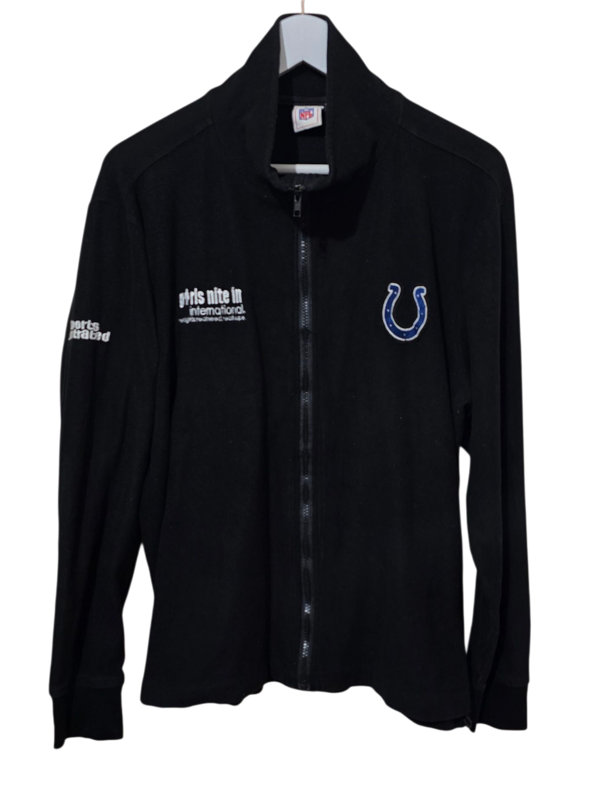 Diese seltene NFL-Fleecejacke in Größe XL vereint sportlichen Stil mit exklusiven Details. Sie verfügt über ein aufgesticktes Indianapolis Colts-Logo auf der Brust, den "Girls Nite In International"-Schriftzug auf der Vorderseite und ein "Sports Illustrated"-Patch auf dem Ärmel. Gefertigt aus weichem, wärmendem Fleece, bietet sie hohen Tragekomfort und ist ideal für kühle Tage oder als Statement-Piece im Streetstyle.