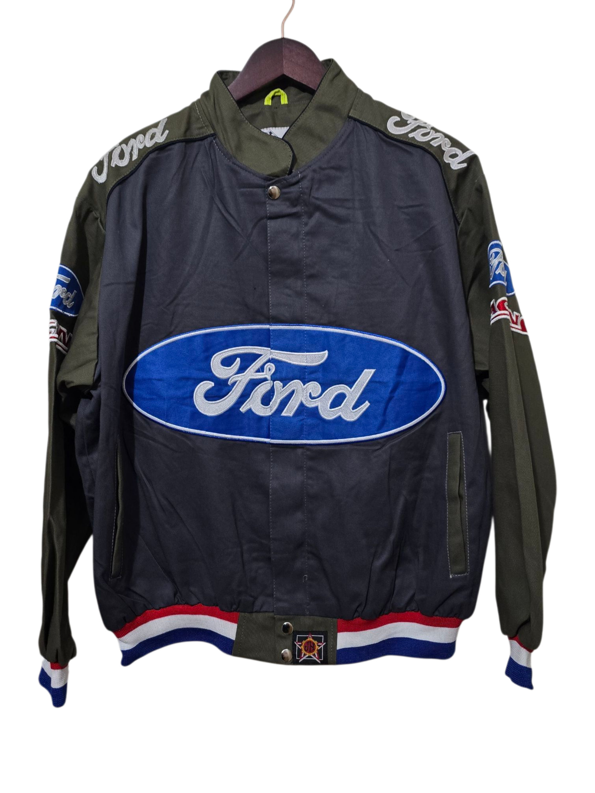 🔹 Details: Hochwertige Stickereien (Ford, Racing, NASCAR, American Flag), bestickter Kragen mit Ford-Schriftzug, doppelte Druckknopfleiste & Reißverschluss, elastische Bündchen & Saum im rot-weiß-blauen Streifen-Look