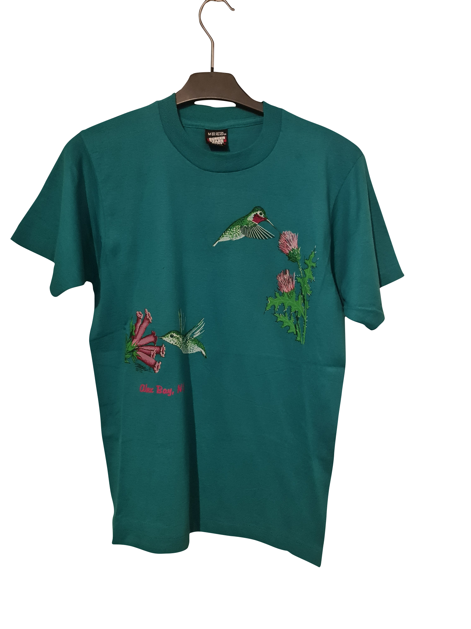 Seltenes 80s/90s-Tee von Screen Stars Best mit farbintensivem Kolibri- und Blumenmotiv sowie „Alex Bay, NY“-Schriftzug.
