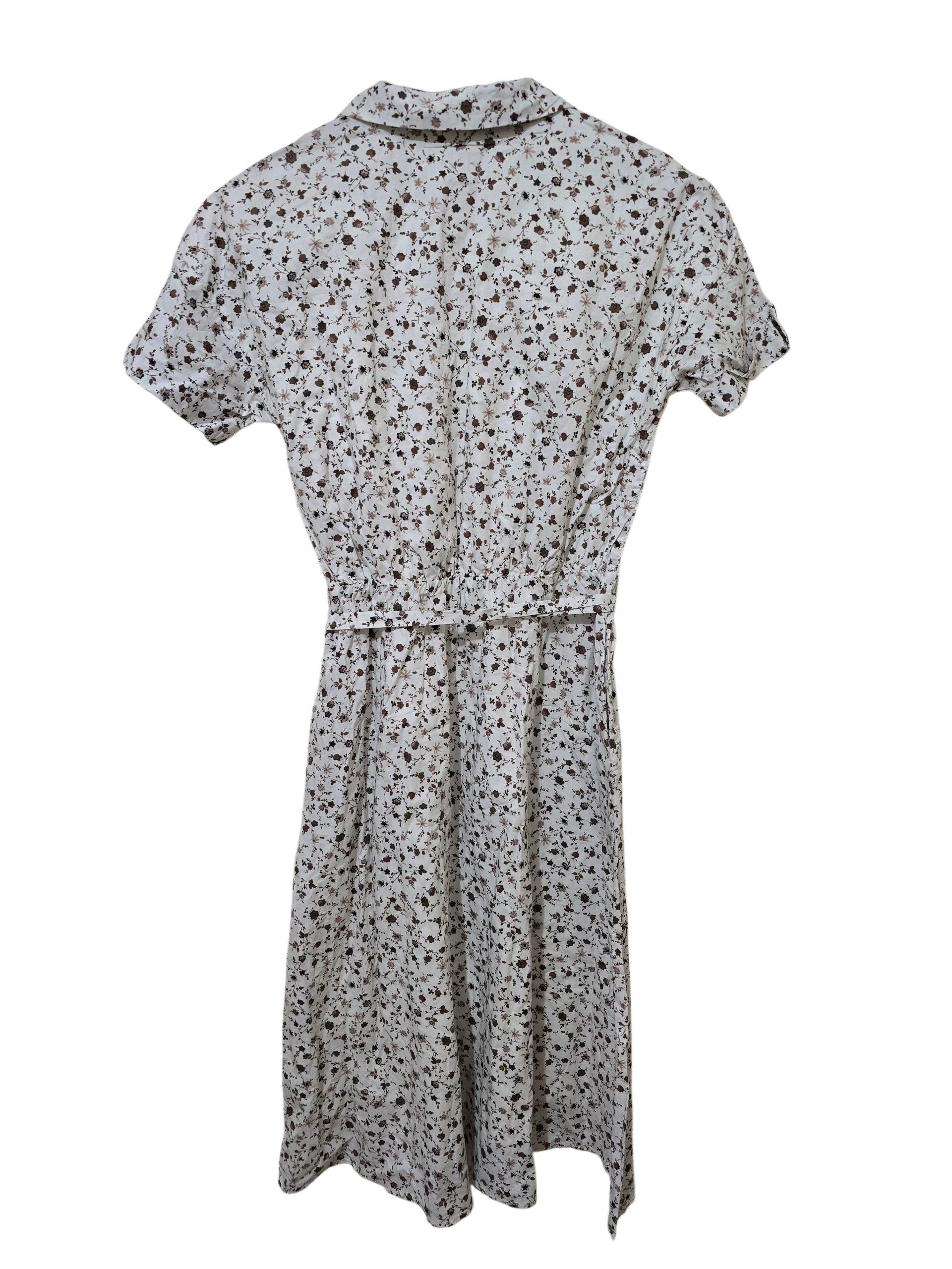 Leichtes Sommerkleid von Sweet Salt in Weiß mit braunem Blumenmuster. Knielang bis wadenlang, tailliert geschnitten mit Bindegürtel und Knopfleiste.
