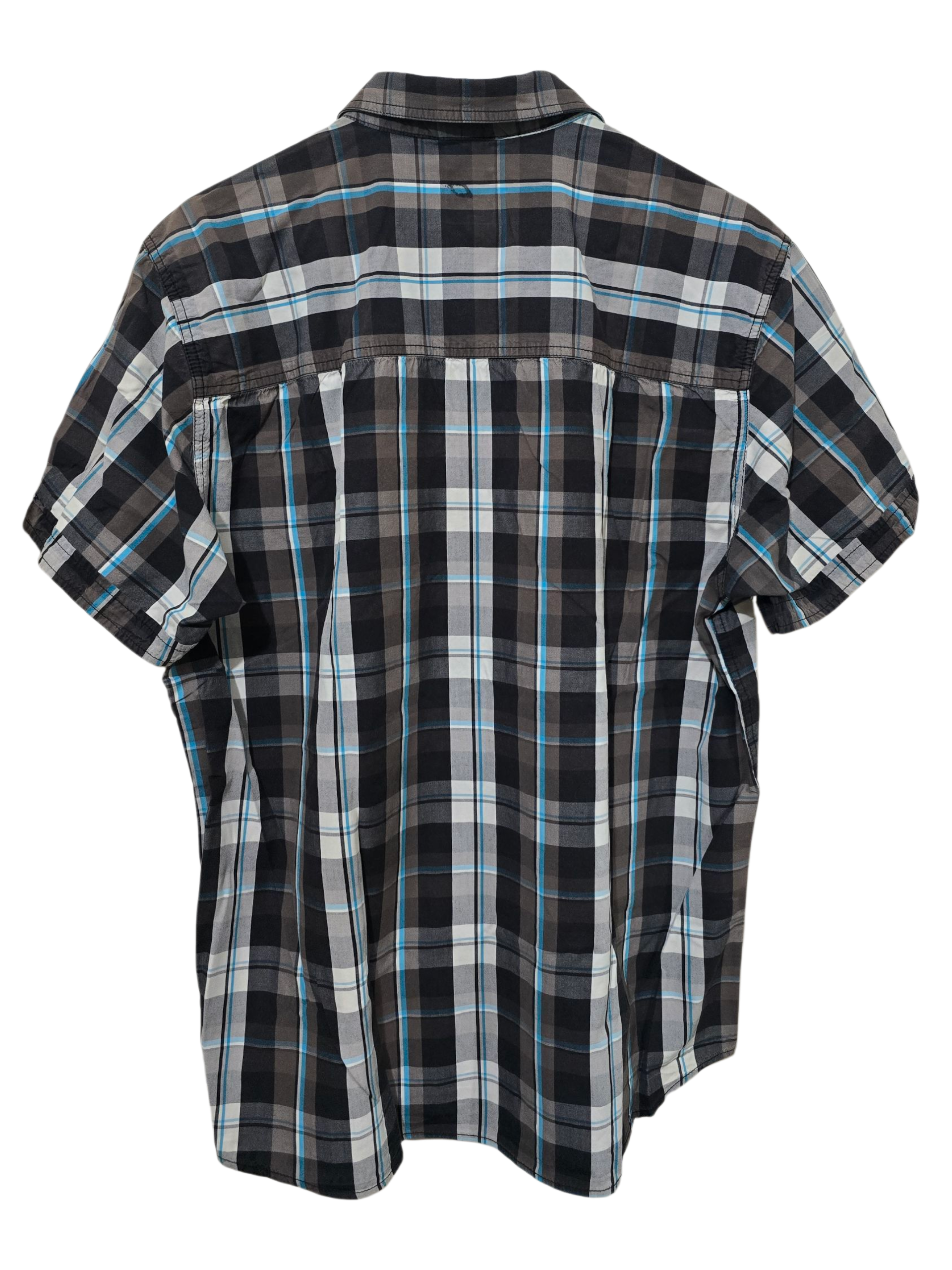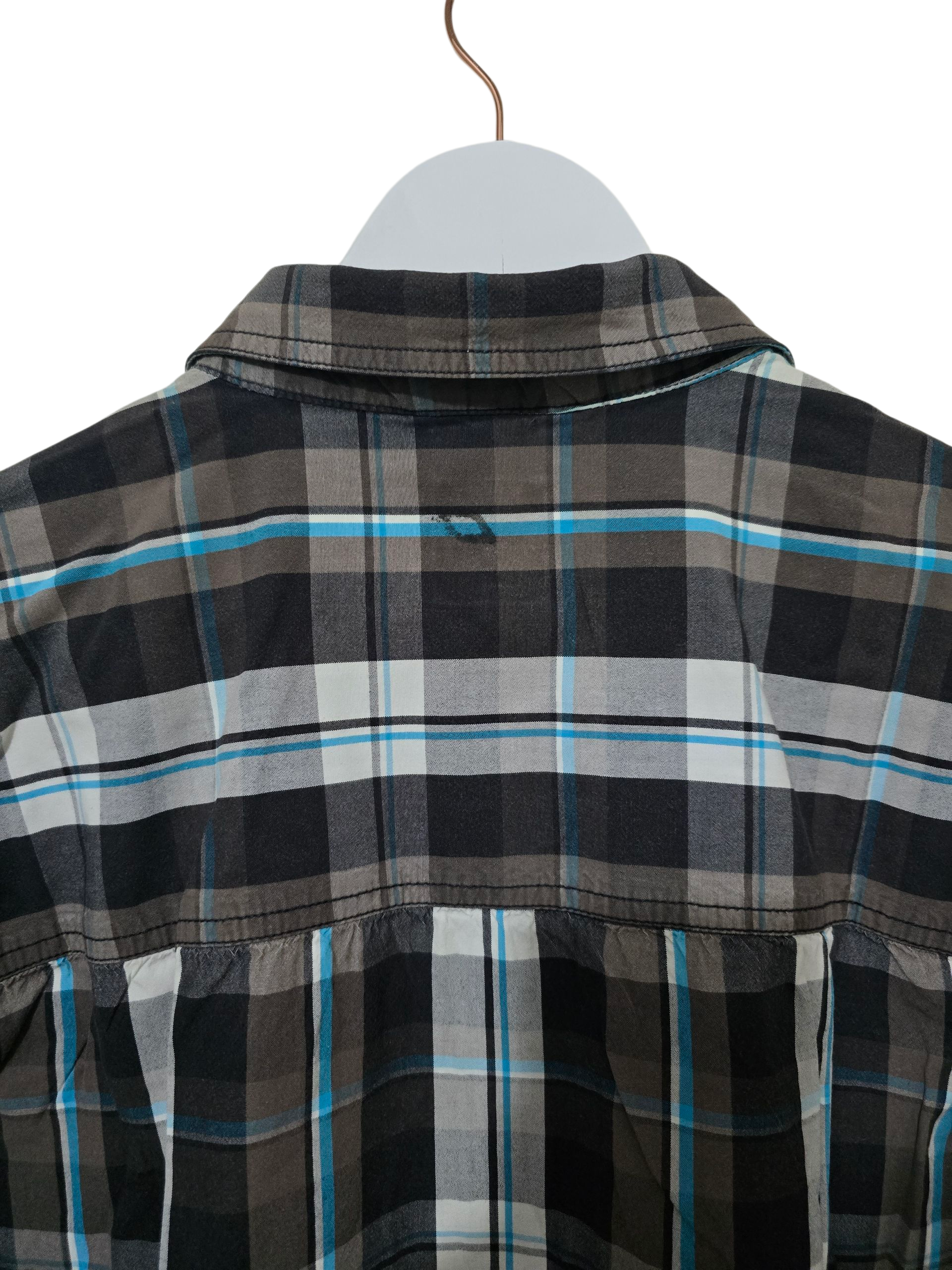 Kariertes Hemd in Schwarz-Grau-Blau mit zwei Brusttaschen und Knopfleiste. Klassischer 2000er–2010er Vintage-Casual-Look.