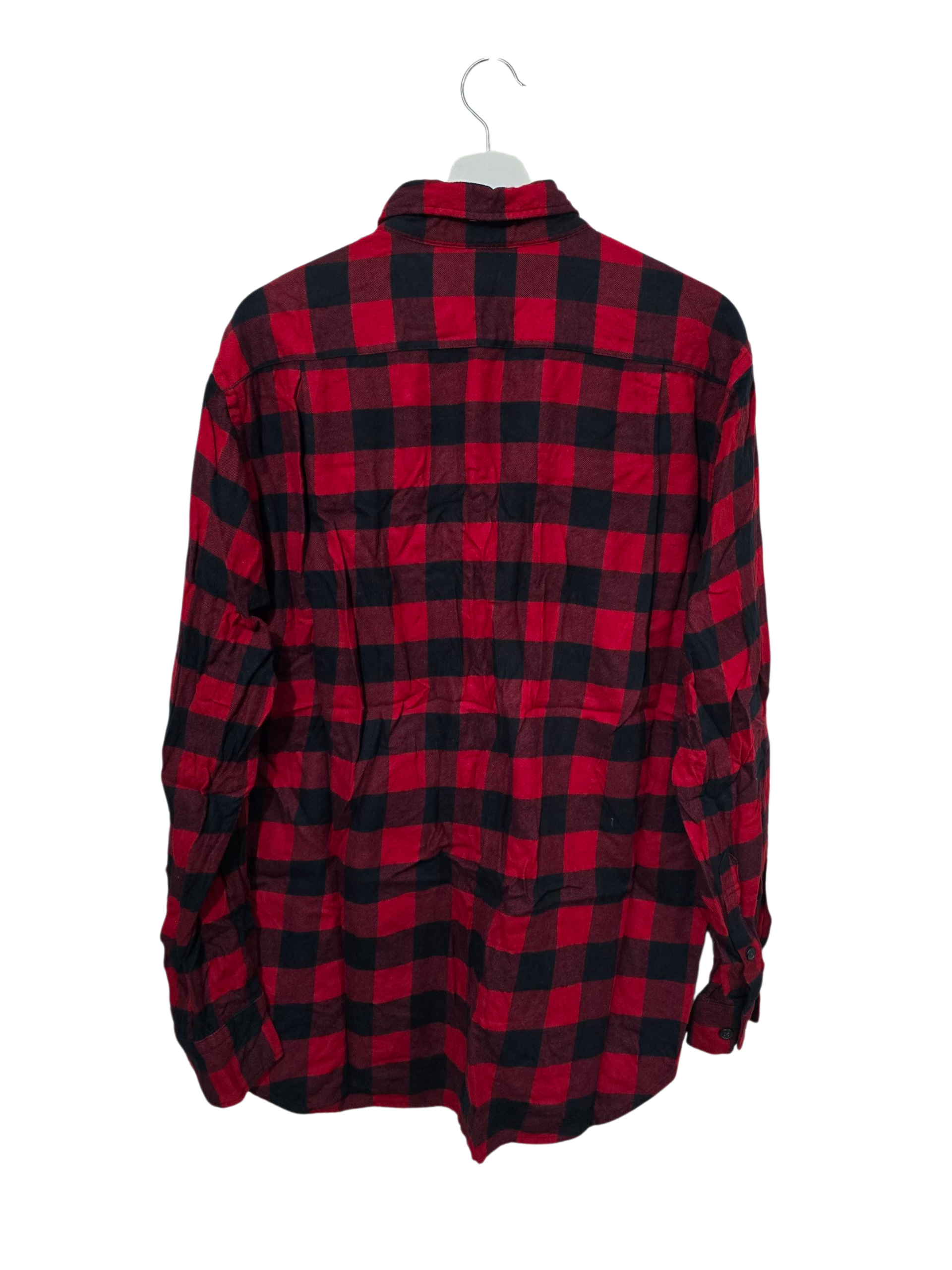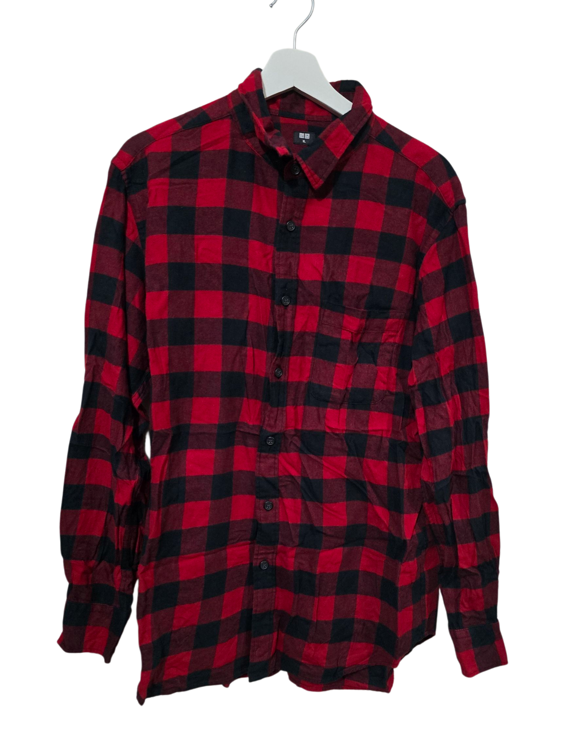 Klassisches kariertes Flanellhemd von Uniqlo in Rot-Schwarz. Regular Fit, weicher Baumwollstoff – ideal für Freizeit und Alltag.