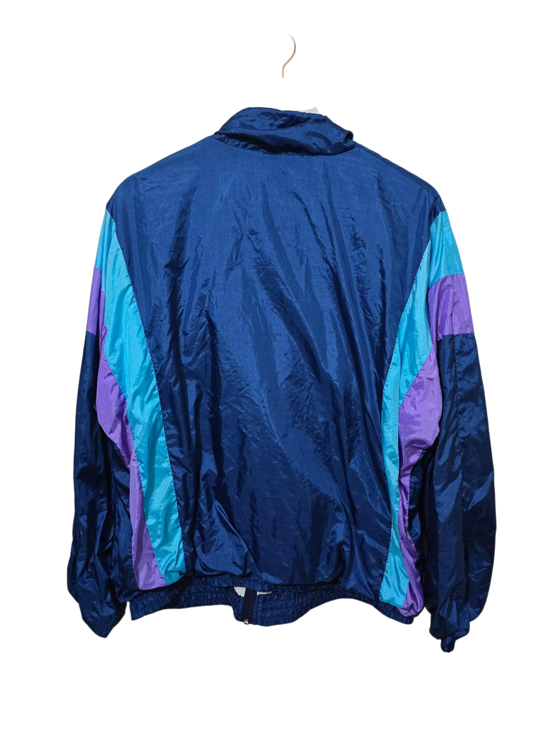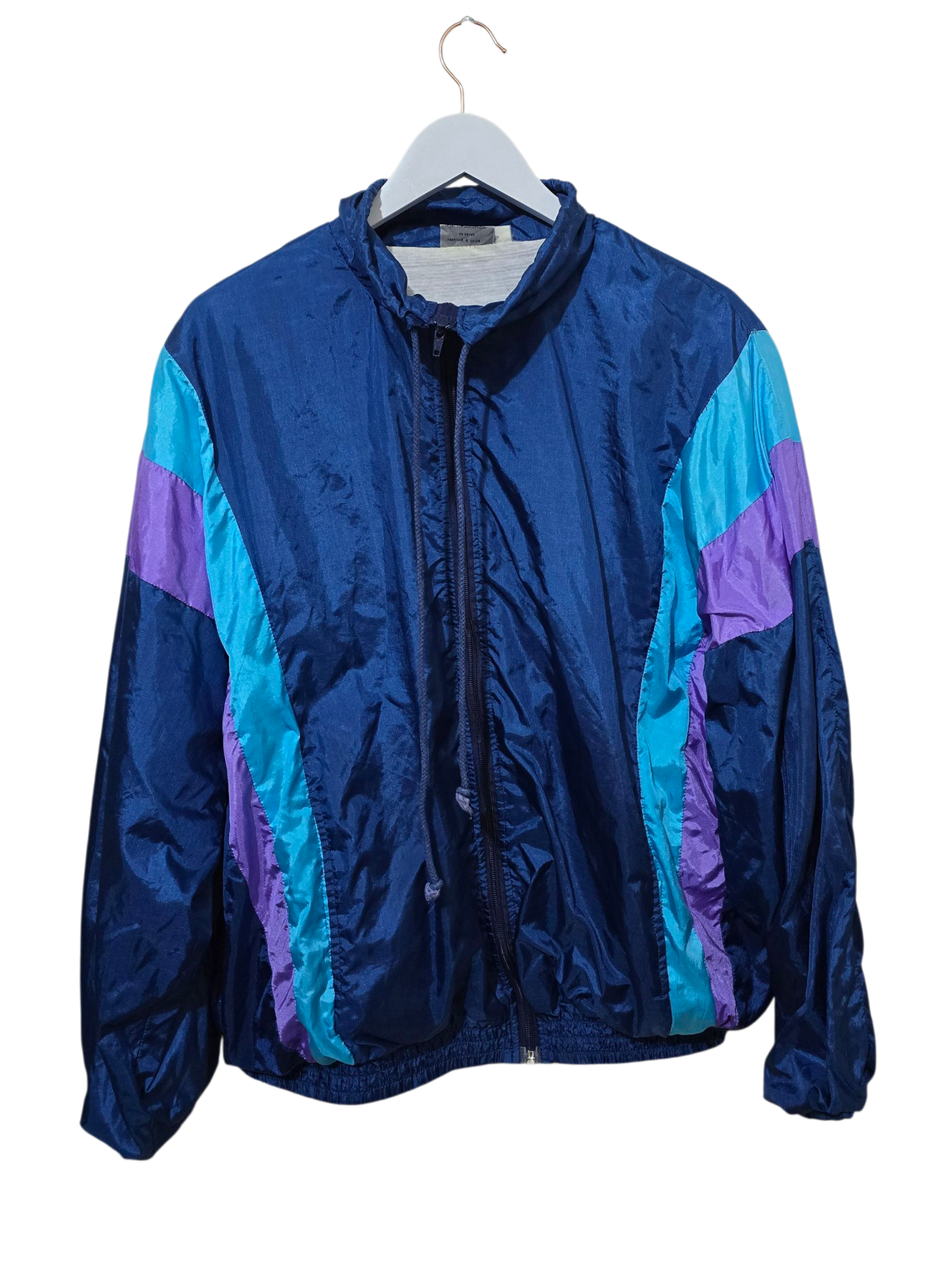 Retro 3 Suisses Trackjacke in Blau-, Türkis- und Lilatönen aus den frühen 90ern. Leichter Oversized-Fit, typischer Crinkle-Nylon-Look und perfekter Vintage-Style für Alltag oder Streetwear.
