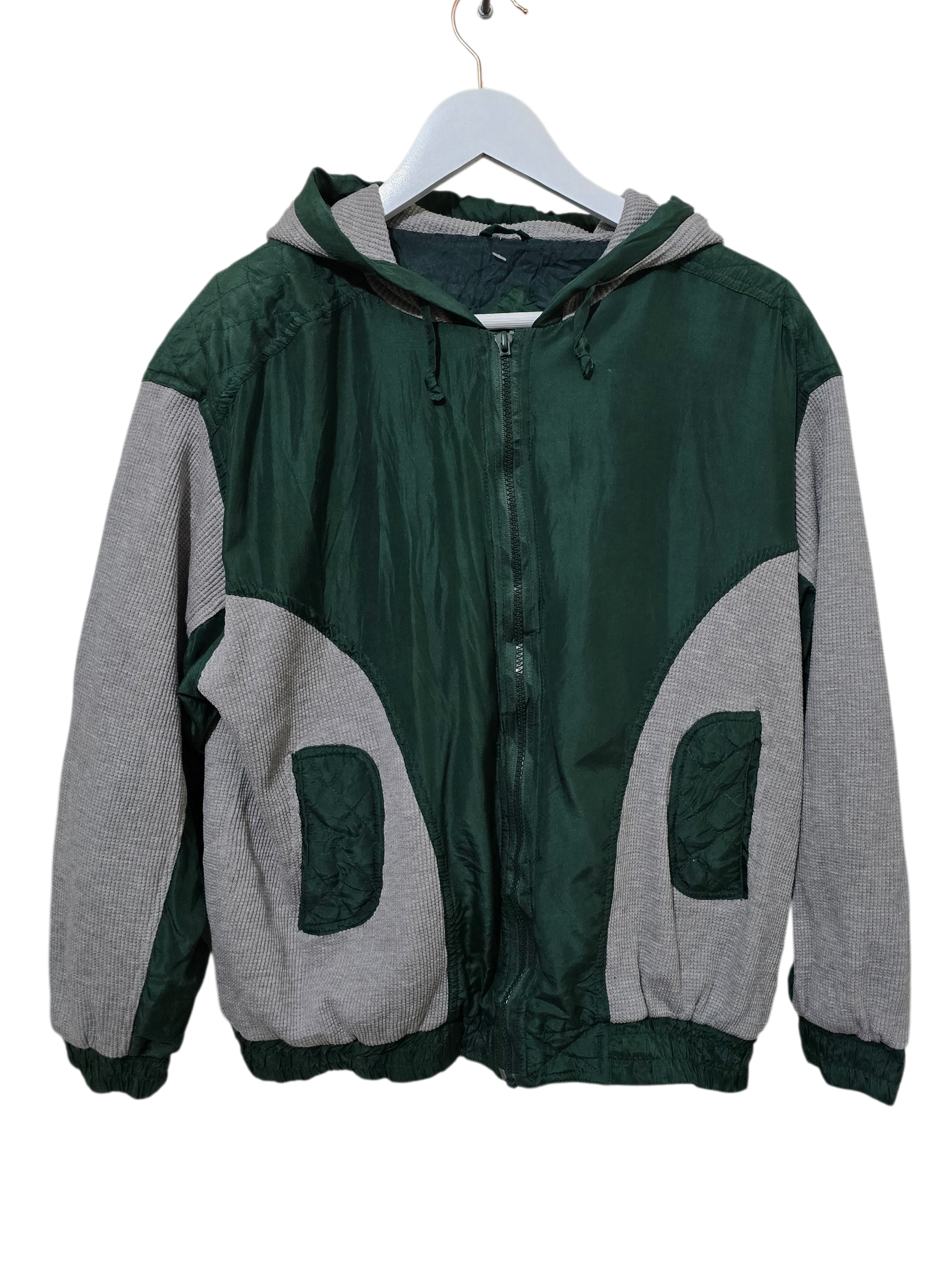 Bogari Jacke aus der frühen bis mittleren 90er-Jahren. Markantes Colorblocking in Grün und Grau mit strukturierter Materialkombination. Sportlich-technischer Look mit boxy, oversized Fit – typisch für europäische 90s Sportswear.
