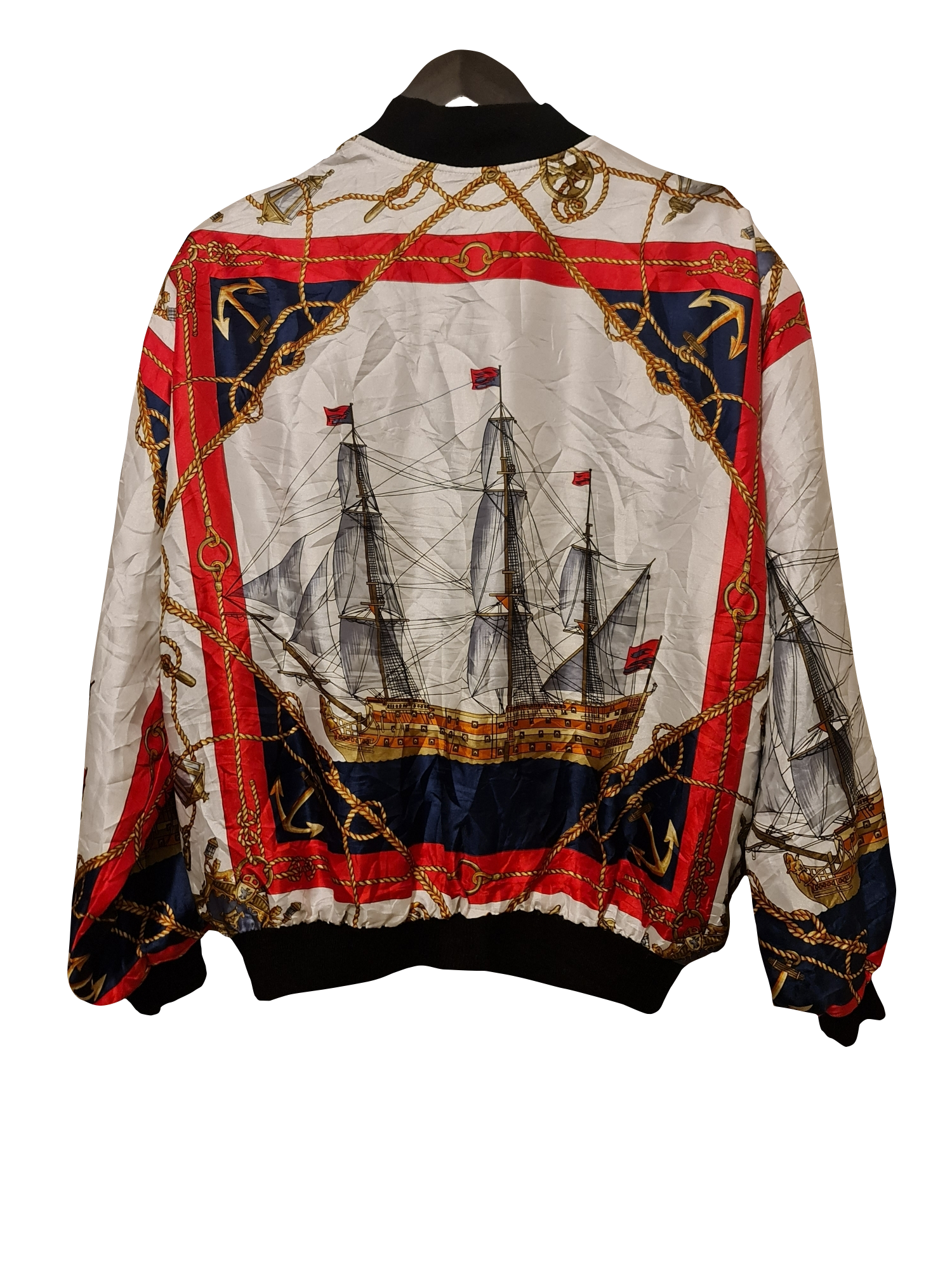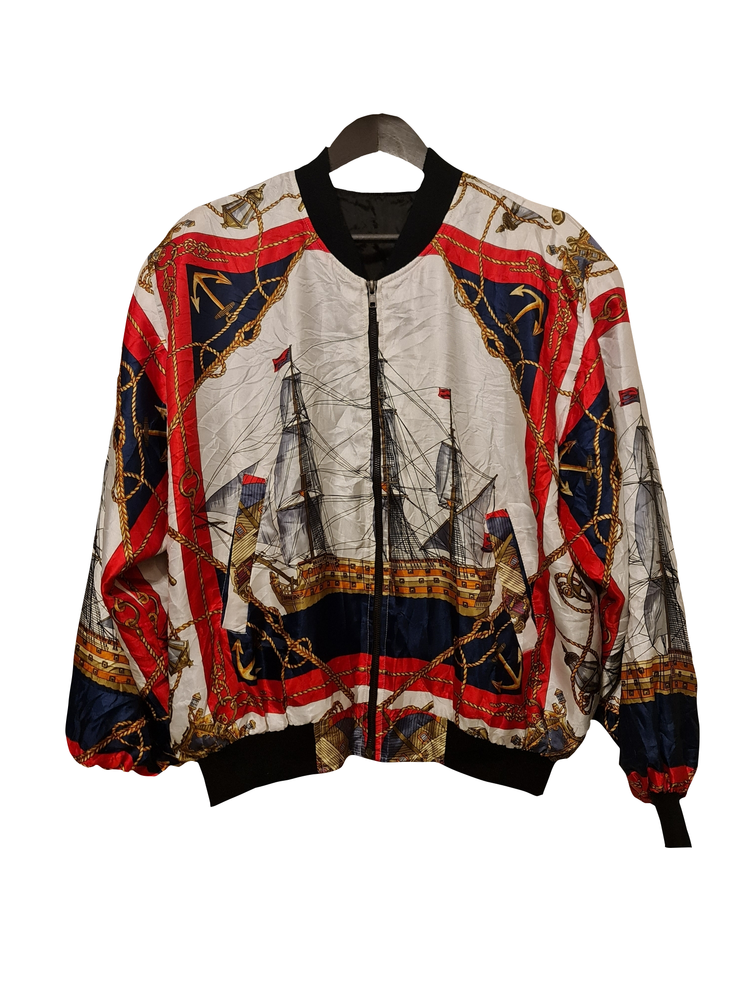 Diese auffällige Vintage Bomberjacke überzeugt durch ihr einzigartiges maritimes Design mit Segelschiffen, Ankern und Taumotiven. Die lebhaften Farben in Kombination mit roten und goldenen Akzenten machen die Jacke zu einem echten Hingucker. Ausgestattet mit einem klassischen Reißverschluss und elastischen Bündchen bietet sie einen bequemen Sitz und sorgt für einen stylischen Retro-Look.