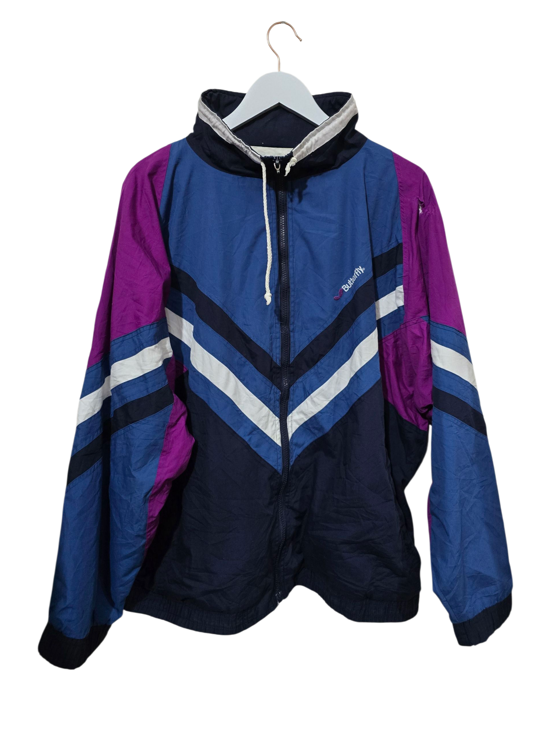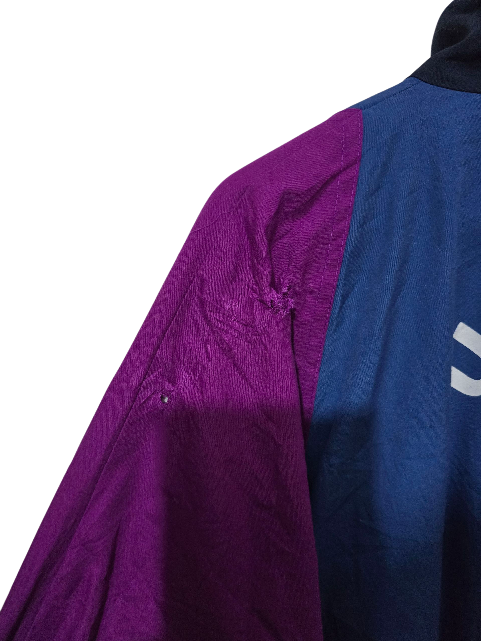 Seltene Butterfly Trainingsjacke aus den frühen bis mittleren 90ern mit klassischem Farbblock-Design in Dunkelblau, Lila und Weiß. Leichtes Nylonmaterial mit sportlichem Schnitt und großem Rückenprint – ein echtes Sammlerstück für Retro- und Tischtennis-Fans.