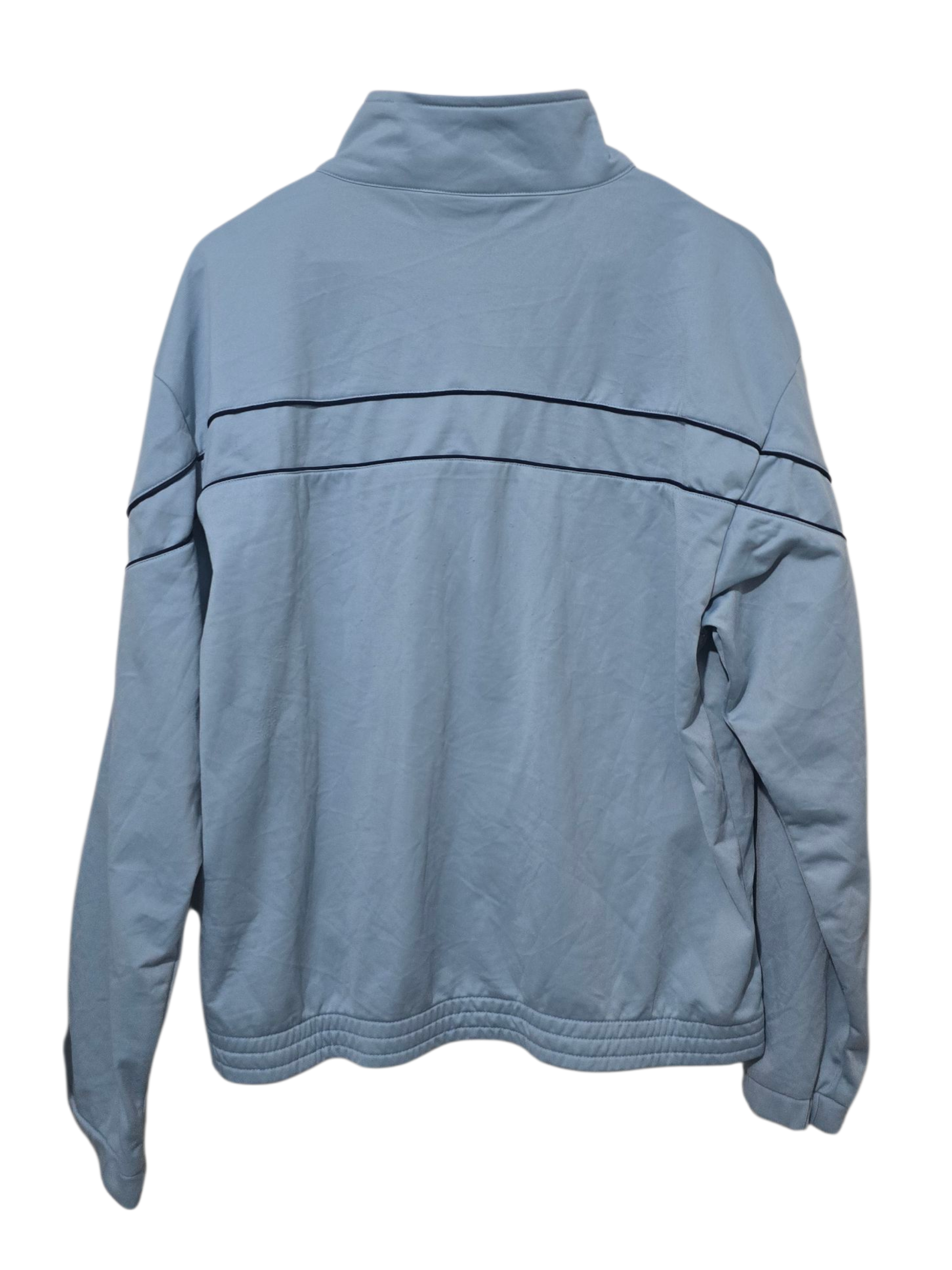 Diese Vintage FILA Track Jacket in Größe L überzeugt mit ihrem minimalistischen, sportlichen Design. Die Jacke ist aus leichtem Material gefertigt und bietet durch den Stehkragen und den durchgehenden Reißverschluss eine angenehme Passform. Die dezenten schwarzen Linien auf hellem Untergrund und das Fila-Logo auf der Brust verleihen ihr einen zeitlosen Retro-Stil.