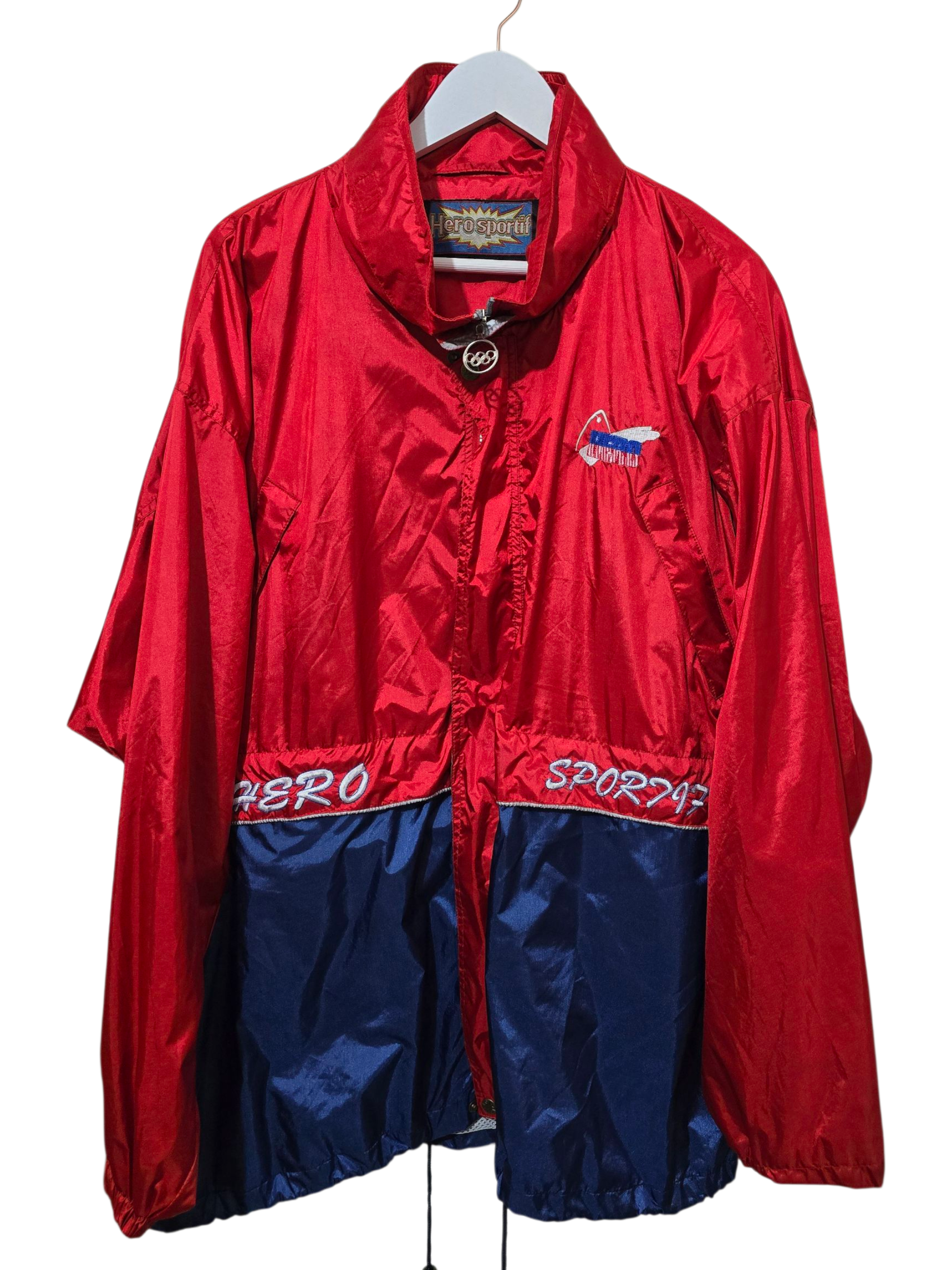 Auffällige Hero Sportif Windbreaker Jacke aus den frühen 90ern in Rot und Dunkelblau. Klassischer Oversized-Schnitt mit langem, locker fallendem Design und sportlichen Details. Aufwendig bestickte Logos vorne und hinten machen sie zu einem echten Hingucker im Retro-Look.