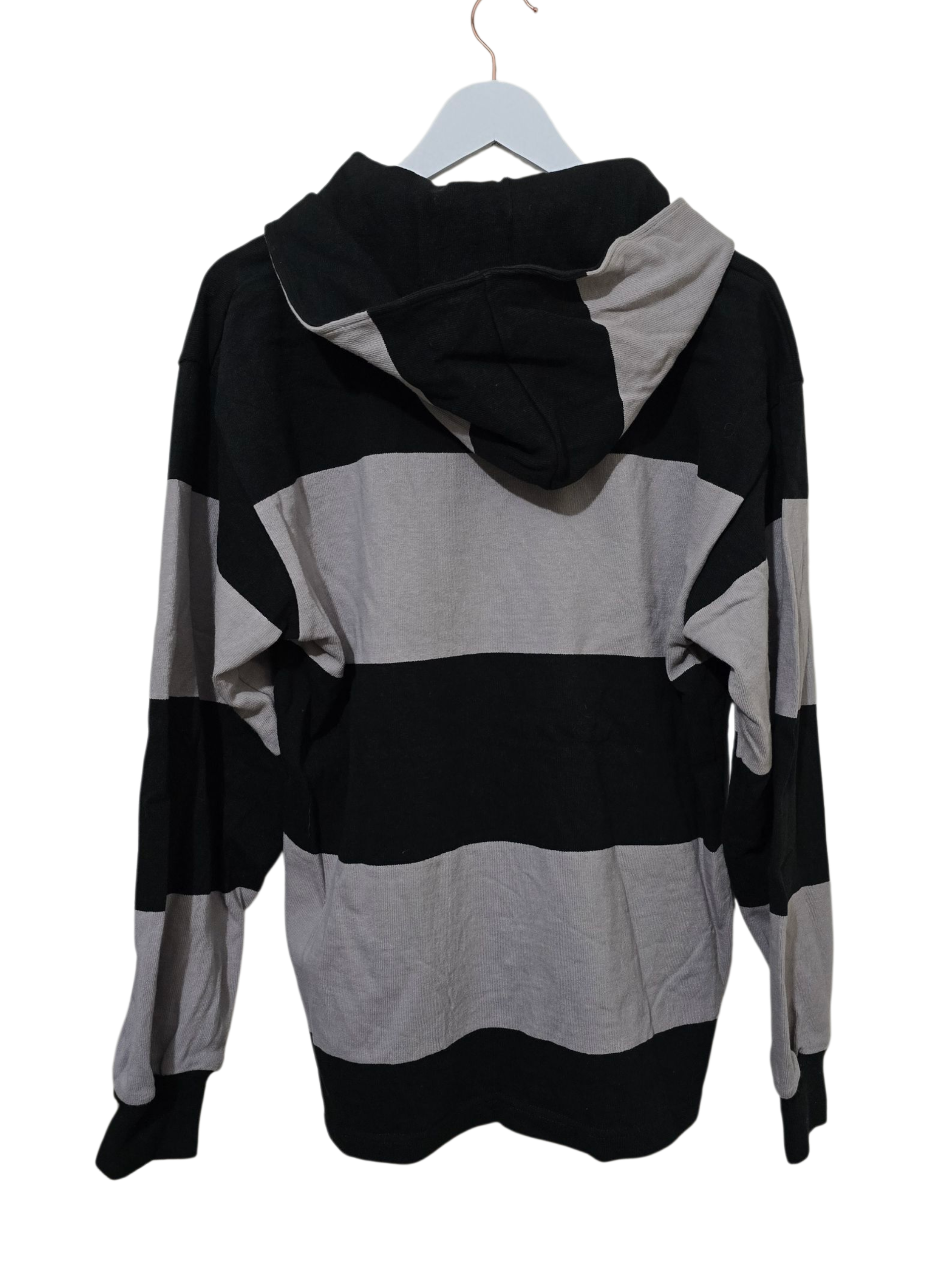 Schwarz-grauer Rugby-Hoodie mit breiten Blockstreifen und gesticktem New-Zealand-Rugby-Logo. Klassischer Regular Fit mit leichter Oversized-Note.