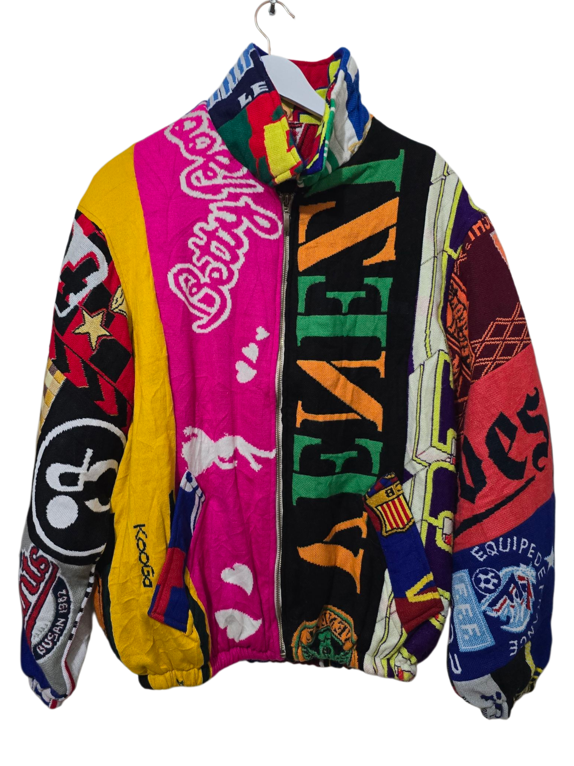 Bunte Patchwork-Jacke aus verschiedenen Fußball-Schals. Auffälliges Einzelstück mit klassischem Oversized-Fit und weicher Innenseite.
