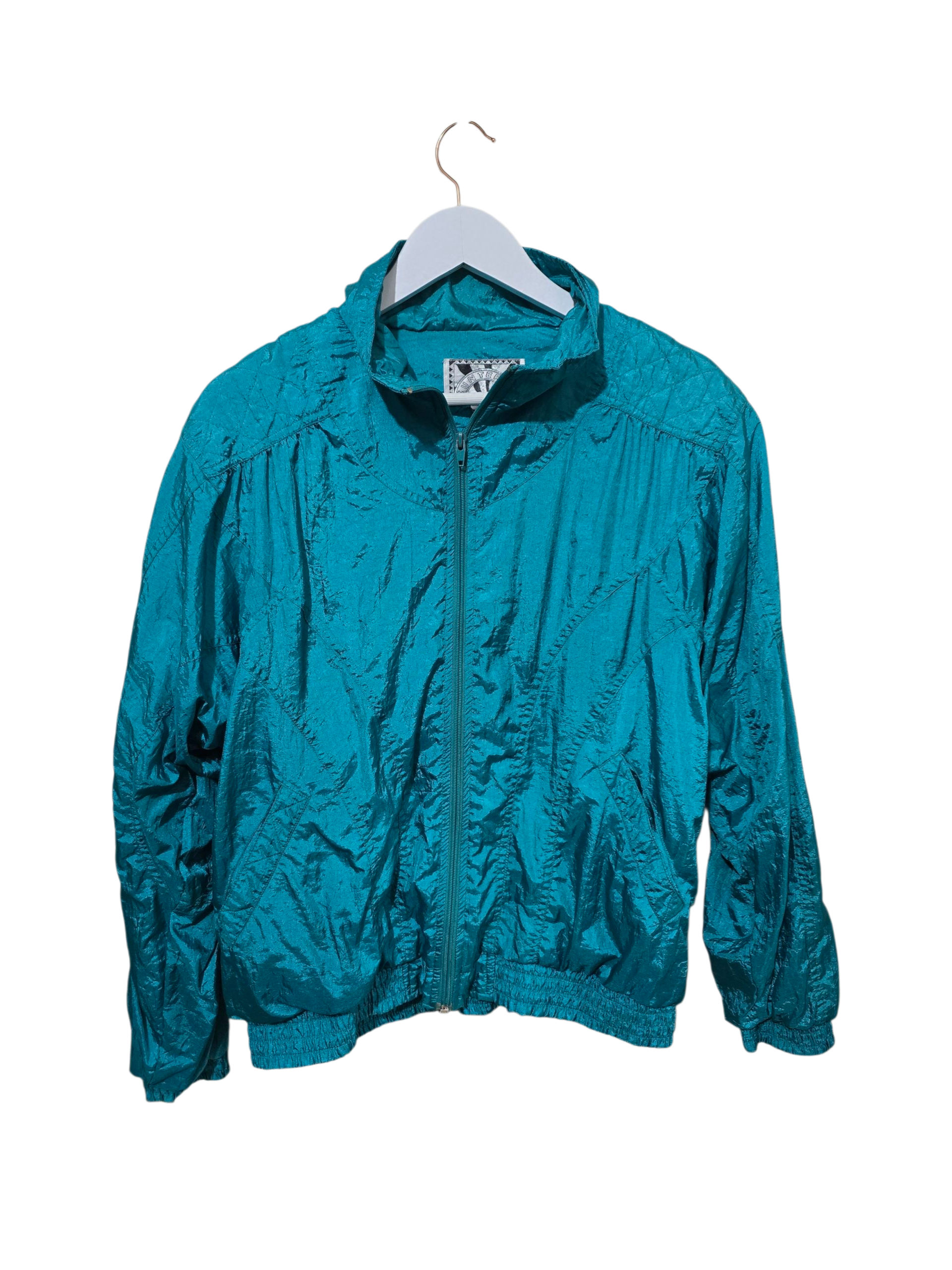 Sunterra Windbreaker aus den späten 80ern bis frühen 90ern in auffälligem Türkis-Blau. Typisches glänzendes Nylonmaterial mit leichtem Knitter-Look und kastigem Oversized-Schnitt – ein echtes Retro-Piece im typischen 90s-Style.