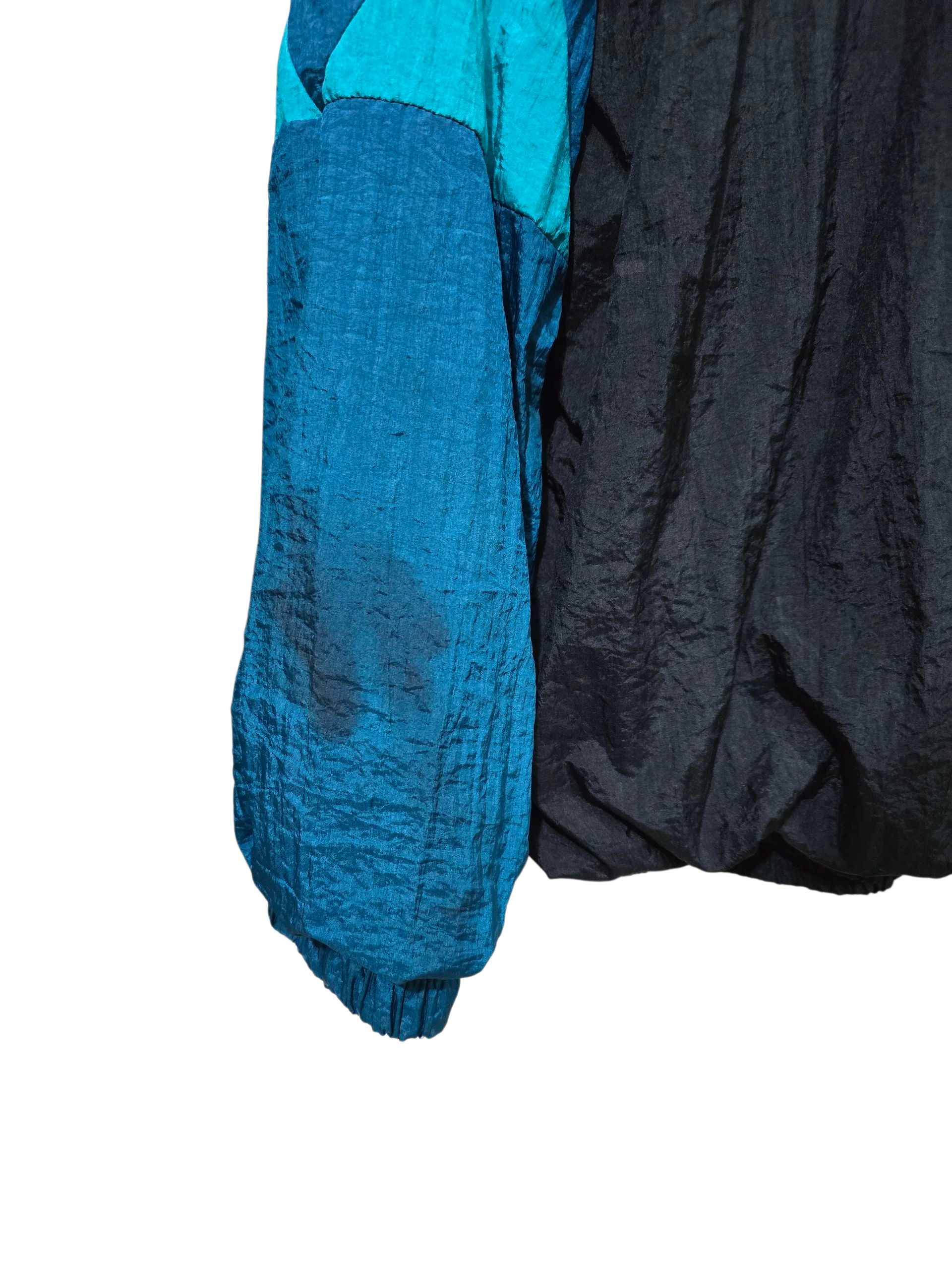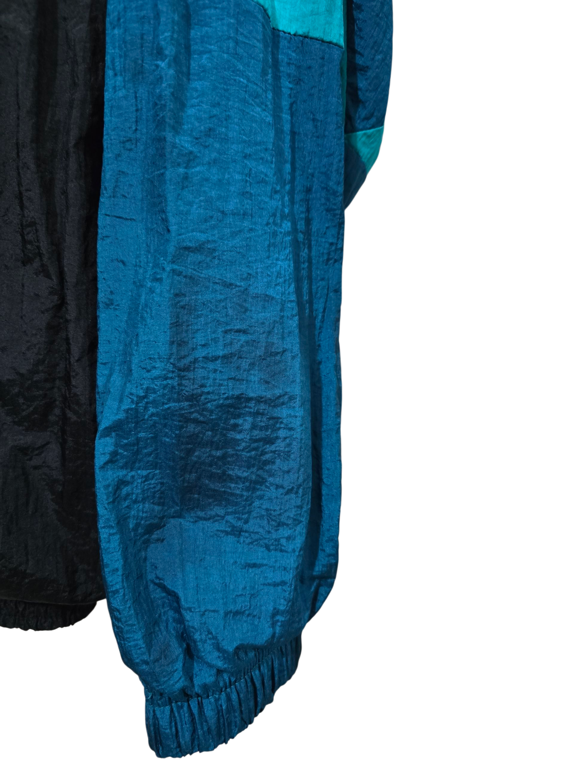 Seltene Todd1 Trackjacke aus Korea im klassischen 90s-Farbblockdesign mit Schwarz-, Blau- und Türkistönen. Lässiger Oversized-Fit mit Raglanärmeln und sportlichem Retro-Look.
